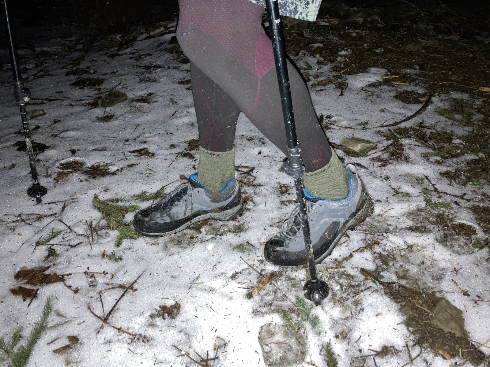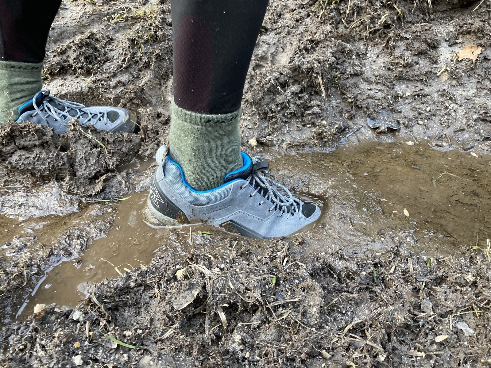 52. kilometr – membrána stále izolovala nohy od bláta a vody, ale na pravé noze, při přechodu větší kaluže, jsem v místě šněrování cítil mírný průsak vlhkosti, levá noha suchá (na cca 55. km jsem si převlékl ponožky)