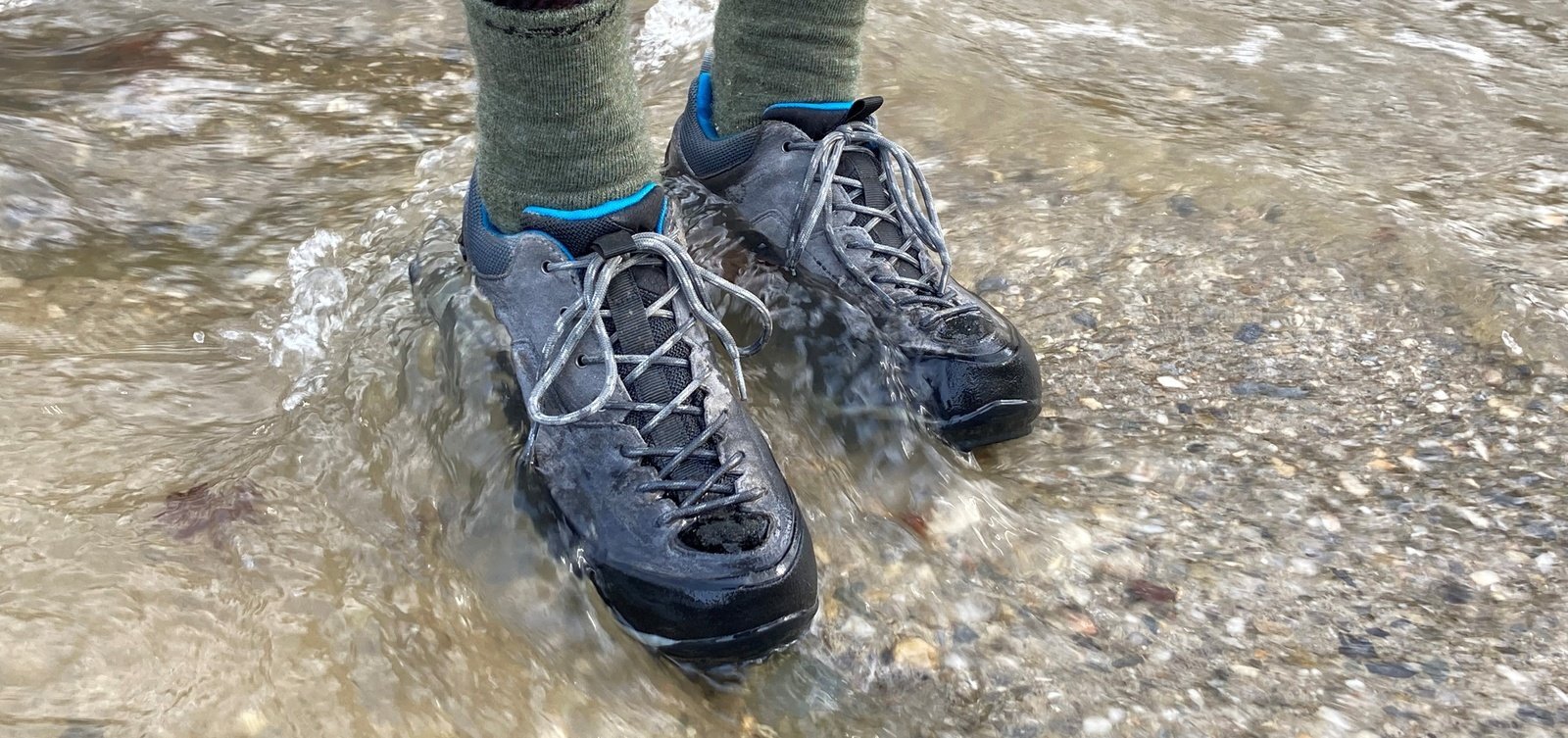 Rozhodl jsem se také prověřit membránu bot v proudu. Při přešlapování a otáčení se v potoce s docela silným proudem, boty obstály na výbornou. V potoce jsem takto strávil přibližně 2 minuty a mé ponožky zůstaly v suchu. Pouze semišová kůže na povrchu boty místy nasála trochu vody. Její vodoodpudivost lze zvýšit impregnací. Nicméně tento test byl zaměřen na membránu a ta obstála.