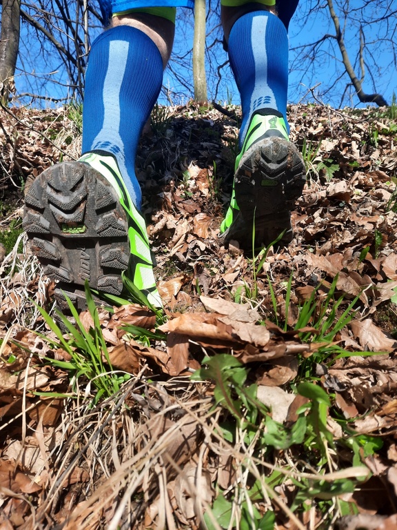 Flexibilita podrážky je velmi příjemná. Podešev žehlí všechny typy podkladů. Kameny eviduji, ale jen jako nerovnost, a to je prima. Dokážu reagovat. Postupně se na mém vysokém nártu trochu začíná projevovat tenký jazyk, přes který začínám cítit tkaničky. Stačí trochu upravit sílu uvázání, opravit přetočenou tkaničku a vše je opět v pohodě.