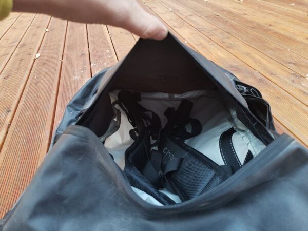 Hrubá nylonová vrstva zabraňuje oděru a vniknutí vlhkosti. Batoh sám o sobě není „vodotěsný“, ale je na 100 % voděodolný. Jelikož je povrch laminovaný, bez problému zvládne středně velký deštík – kapky po něm ochotně sklouznou. Spodní část, která je zpevněná, protože je zde dán největší důraz na odolnost, nemá nylonový zátěr a je z hlediska voděodolnosti nejslabším článkem povrchu. Pokud bude pršet, doporučuji ho postavit správným směrem, tedy spodkem dolů. Vzhledem k hladkému povrchu batohu se dá bez problémů a rychle otřít mokrým hadrem.