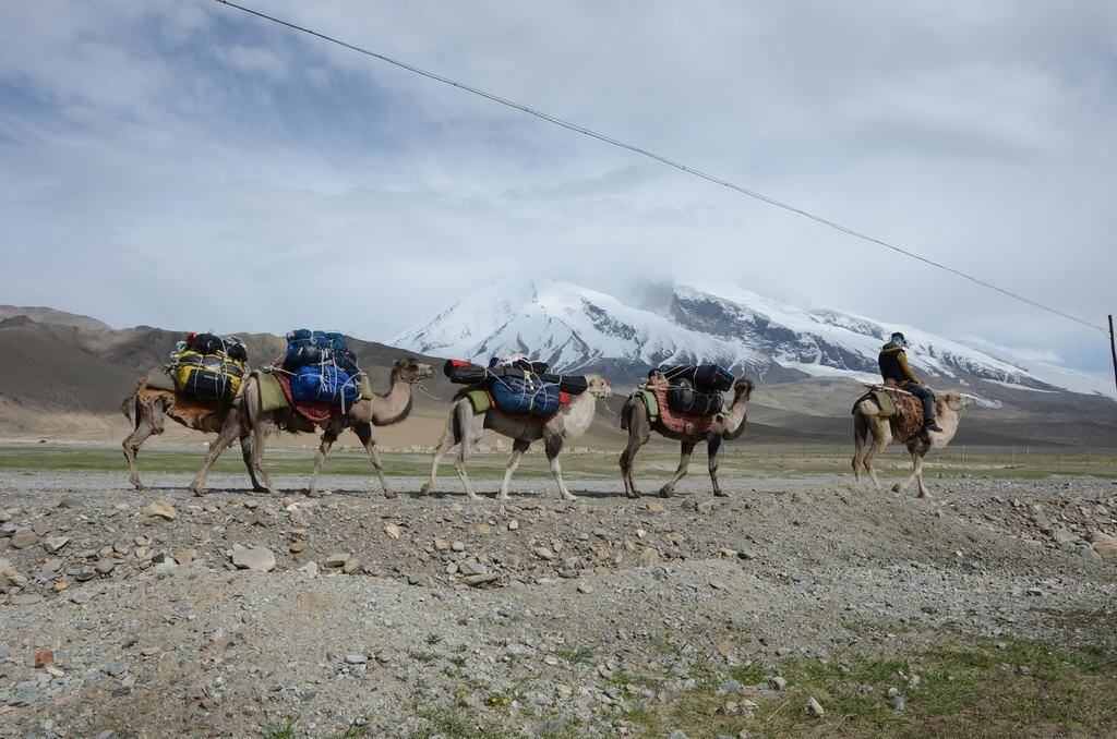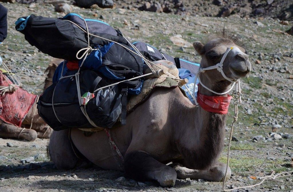 Osprey Transporter 130 l naložený na velbloudovi. Všimněte si lan, které jej pevně stahují