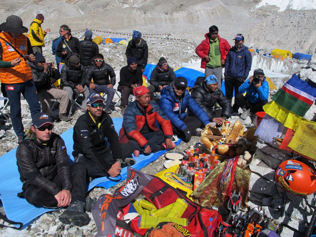 Puja pod Everestem a Lhotse. Bez tohoto budhistického rituálu, který by nám měl zaručit šťastný návrat z kopce, se nikam nevydáváme.