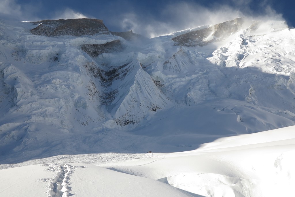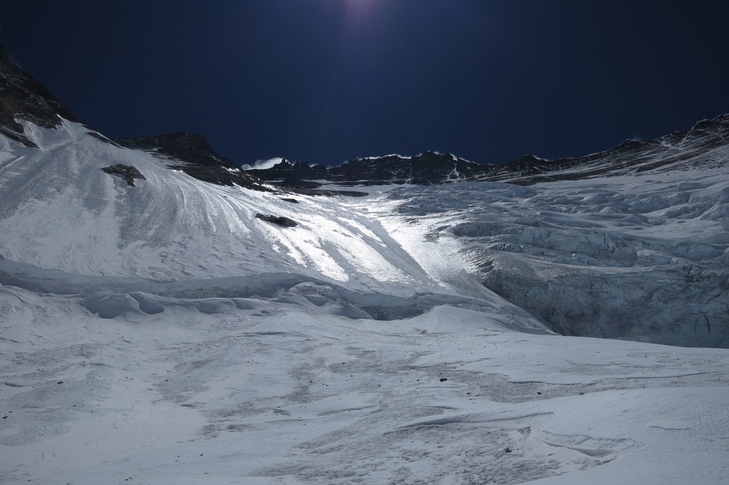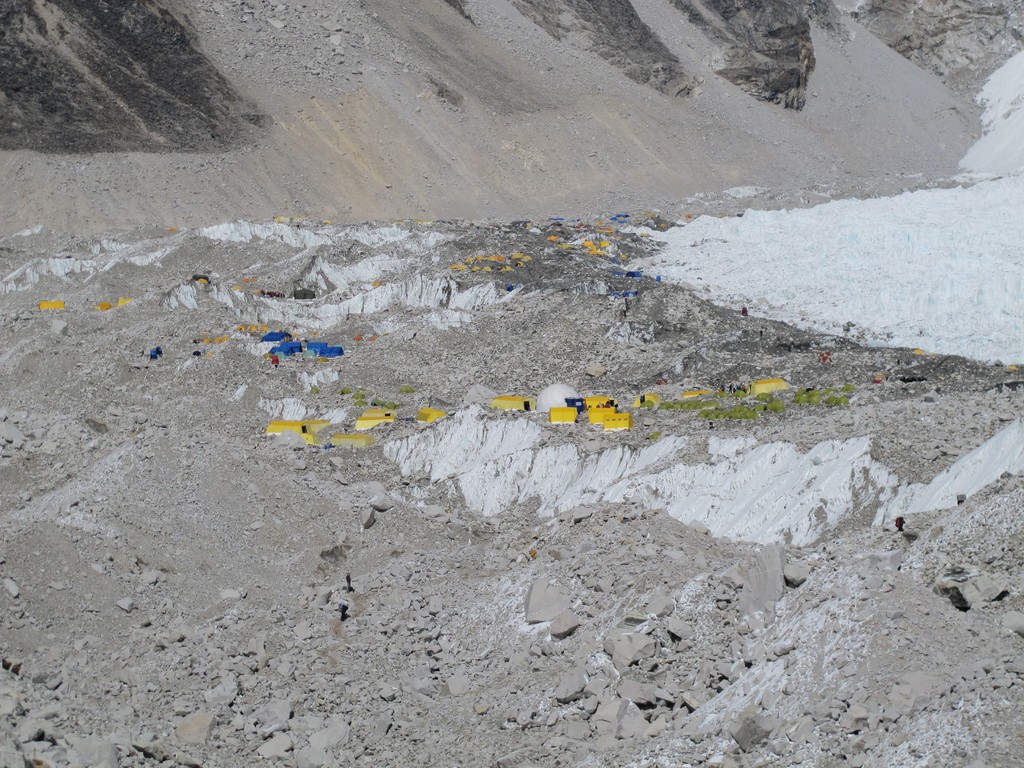 Bohužel nám teplé počasí dalo stopku. Kameny lítaly hlava nehlava. I přesto, že jsme předběhli a zde byli první ze všech „zájemců“ o nevšední zážitky spojené s výstupem na nedaleké osmy (Everest a Lhotse), museli jsme zavelet k ústupu. Pokud bychom nechtěli být padajícími panáčky, sraženými šutry.