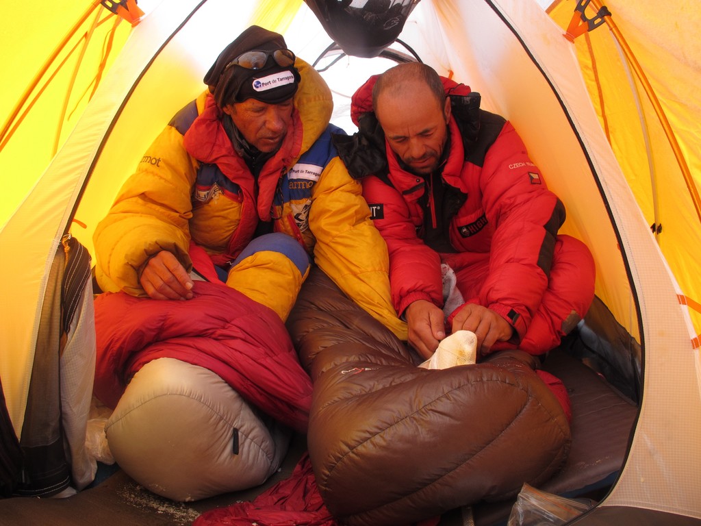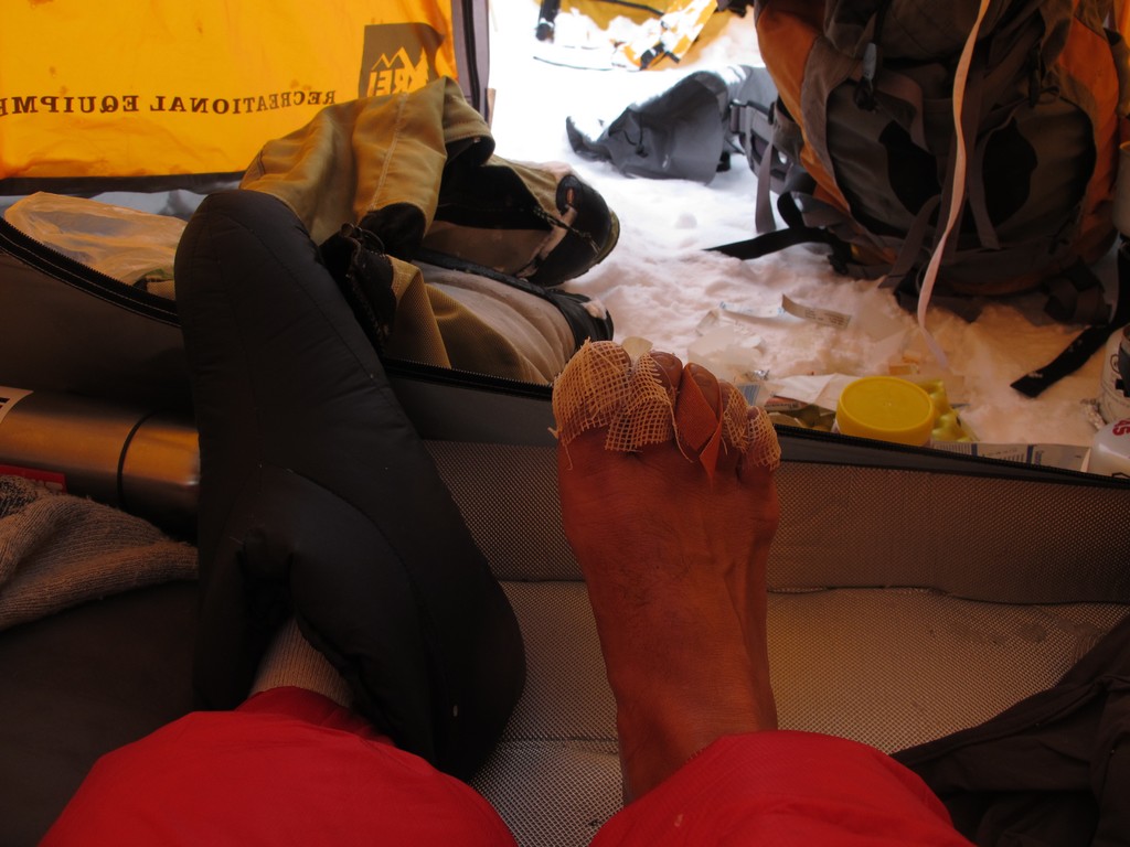 Po mém sestupu do posledního výškového tábora v 7000 m jsem zjistil, že Radek již ošetřuje prsty na nohou. Omrzlinky to byly nepěkné. Hodně zima v noci, vlhké boty a spousta dalších faktorů způsobila puchejře. Druhý den rychle dolů, dokud se vejde do bot. Já se snažím z kopce snést aspoň ty nejdůležitější věci, jako jsou foťáky atd.