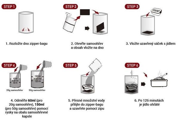Při samoohřevu sáček s jídlem vložíte do speciálního ohřívacího vaku, tzv. Zipper-bagu, přidáte samoohřevnou kapsli a trochu vody. Samoohřevná kapsle je jednorázová a funguje na principu exotermické reakce mezi nehašeným vápnem a vodou. Ta vytvoří teplotu až 100°C a takto horká pára ohřeje jídlo i v extrémních podmínkách za 12 minut. Zipper-bag můžete používat znovu a znovu, kapsle je po použití zcela rozložitelná, tudíž jí můžete zakopat kdekoli v přírodě.