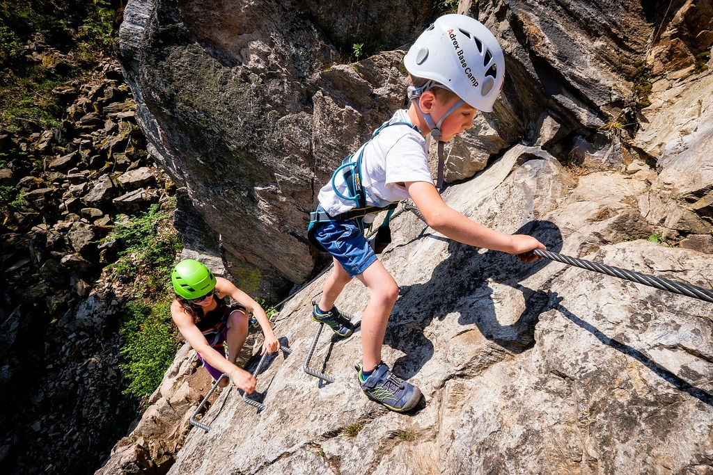 Děti vybavte kombinovaným nebo celotělovým úvazkem, helmou a dětským ferratovým tlumičem pádů