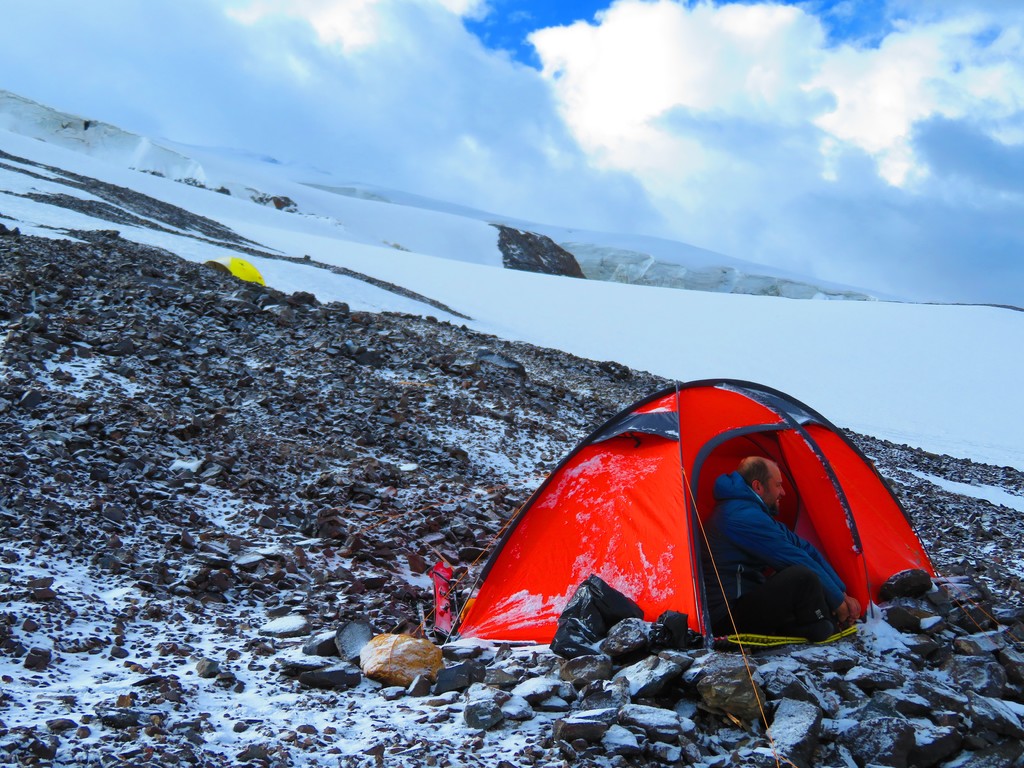 Čtyři dny lopocení po kopci a konečně se za krásného slunného počasí jako jediní ten den (10. 7.) dostáváme na vrchol. Užíváme si výhledy, děláme fotky, aby se mohli pokochat i všichni doma. Těšíme se na parádní sjezd. Přes noc napadlo 50 cm prašanu, takže bude stát za to. Čtyři hodiny po dosažení vrcholu už sedíme ve stanu s Míšou na pivku a sdílíme své zážitky. Jsme hodně unavení, ale šťastní, že to tak krásně vyšlo a my měli štěstí se podívat až nahoru.