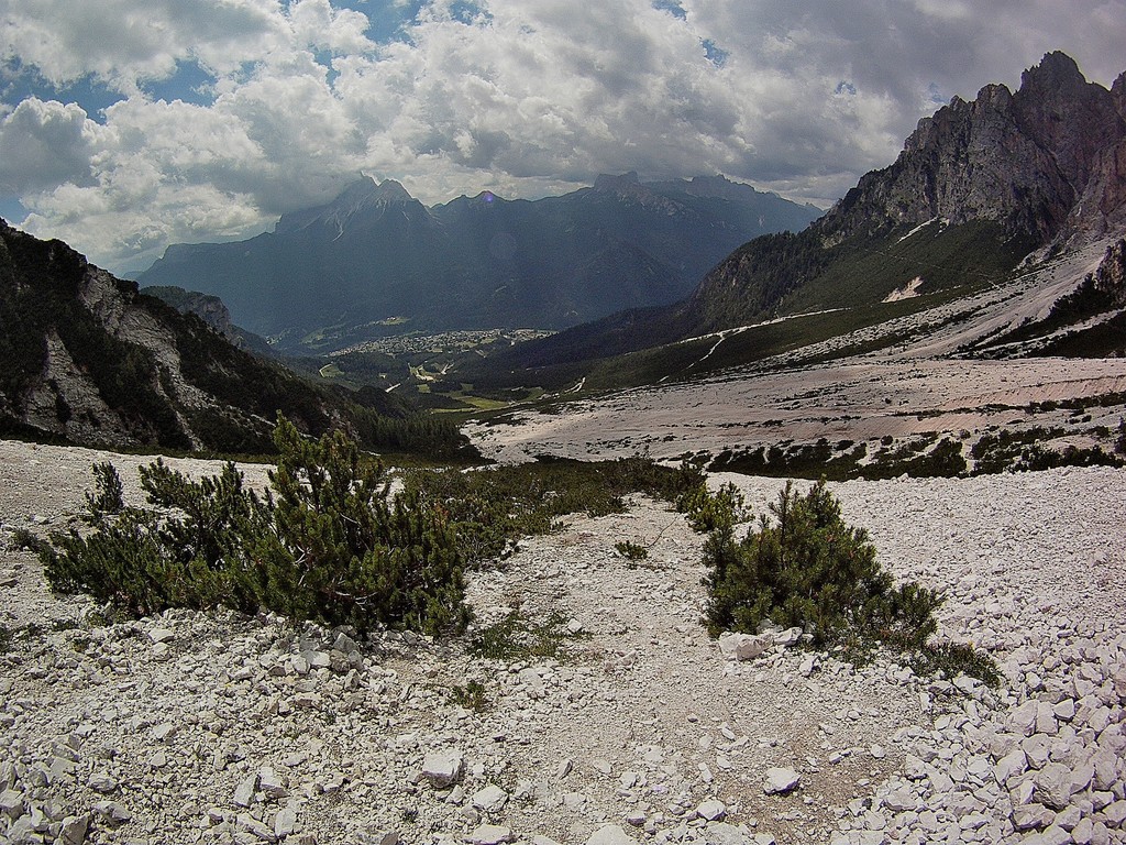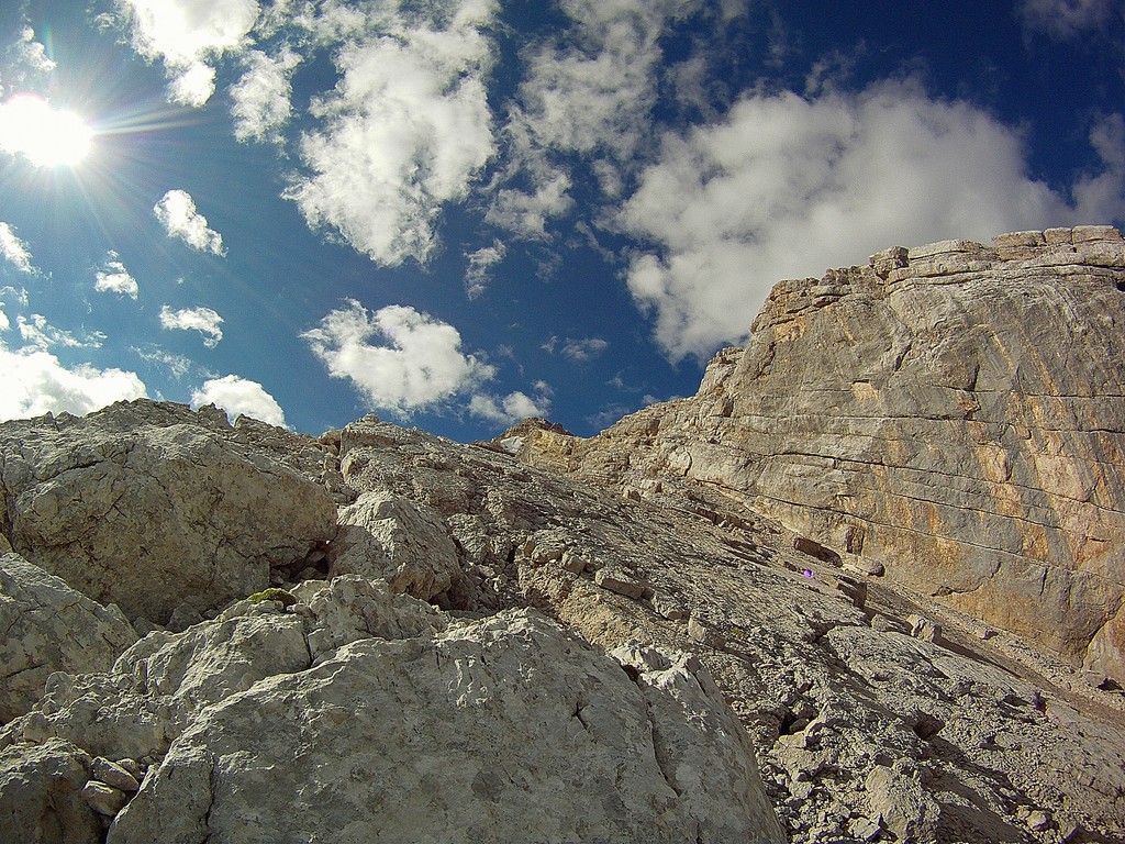 Začátek výstupu vedl zpočátku po sjezdovkách. Za chatou Rifugio Scotter-Palatini se začalo stoupat po obrovském suťovišti ve vyšlapaných cestičkách.