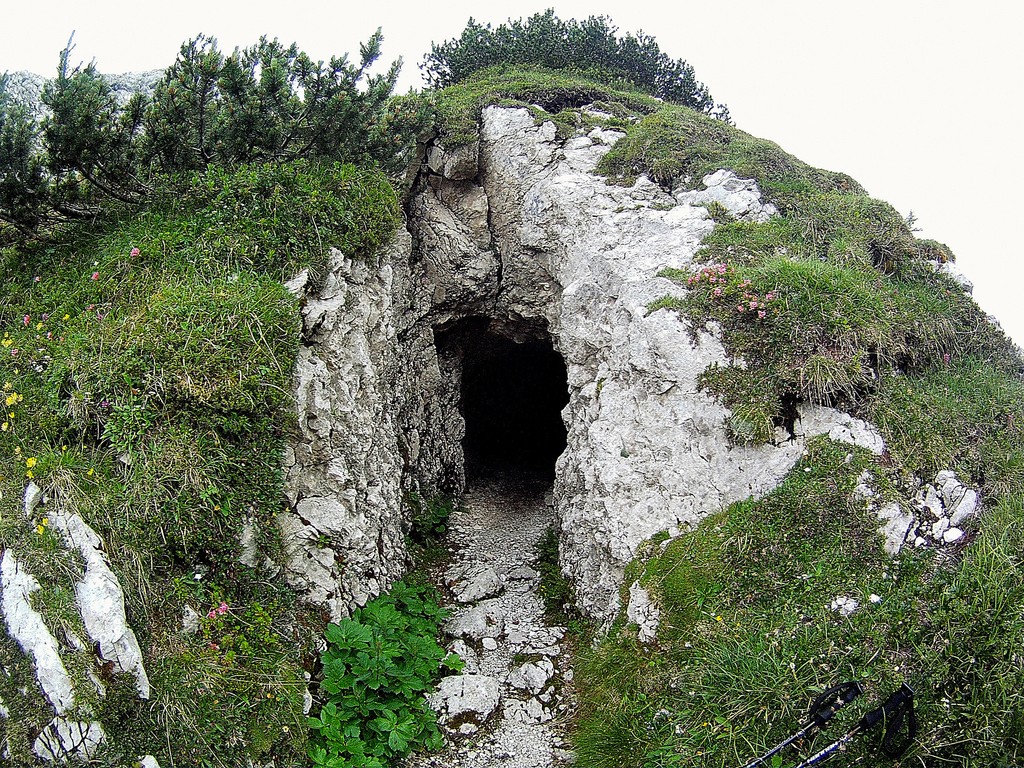 Na sedle Forcella Piccola končila první část výstupu. V této jeskyni jsem si postavil stan a přečkal zde noc, chráněn před případnou nepřízní počasí. Přes noc i trochu pršelo. Když byste neměli s sebou stan, kousek za sedlem se nachází chata Rifugio Galassi, kde můžete přespat v pohodlí horské chaty.