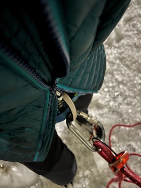 Délka bundy zhruba do třetiny zadku je tak akorát pro pohodlné lezení, jištění i chůzi, s případným prodloužením bundy by zbytečně naskakovaly gramy váhy. Zip při úplném dopnutí končí někde mezi ústy a nosem, což je skvělé, když se potřebujete pořádně zachumlat. Při aktivnějším pohybu jsem ho rozepínala přibližně k bradě, abych si do bundy nenadýchala vlhkost, ale krk měla přitom stále spolehlivě v teple. Pod bundu se mi v běžně nošené velikosti 36 pohodlně vešly dvě vrstvy oblečení.