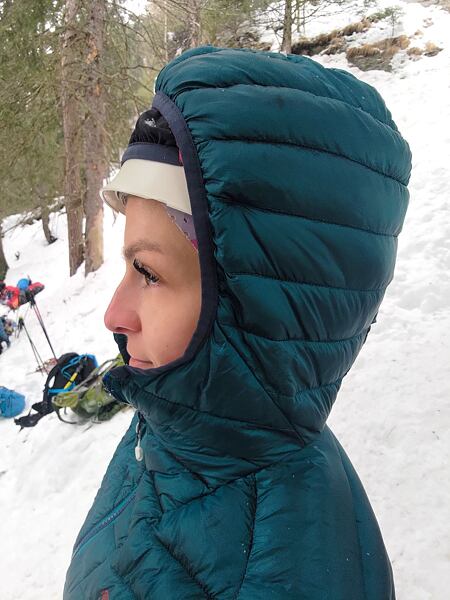 Gumu se zdrhovadlem osazují Rafiki na každý svůj kousek trochu jinak – u syntetické zateplovačky Darcy ladila přiléhavost kapuce zepředu, u péřovky Morena uzamykala teplo stažením spodního okraje a bunda Nevis ji má v zadní části kapuce, čímž se Rafiki elegantně vypořádali s faktem, že lezecké helmy mají různé průměry a tvary.