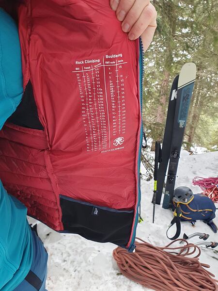 Na vnitřní straně vás Nevis potěší vytištěnou škálou lezeckých a boulderových obtížností, můžete si tak přehledně srovnat UIAA, francouzskou a yosemitskou stupnici a u boulderů se nikdy nezamotáte do odlišností mezi Font a Véčkem.