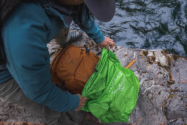 Pláštěnka od značky Osprey je skladná, jde sbalit do přiložené kapsy s poutkem