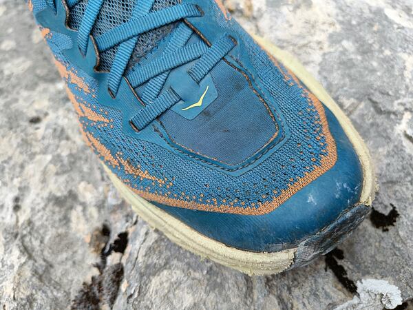Materiál je také hodně pružný, krásně nohu obejme, zastabilizuje a přitom neubere na pocitu komfortu. Životnost svršku jsem prověřil, myslím, víc než vydatně. Po cca 800 km, které zahrnovaly běhání opravdu cestou necestou, ostré kamení, větve … si troufám tvrdit, že je téměř nesmrtelný. Jediný šrám mu uštědřila ztopořená větev, kterou jsem bolestivě nakopl a vrchní vrstvu natrhl. Větev ale skrz nepronikla a na nártu zůstala jen památka v podobě slušné modřiny.