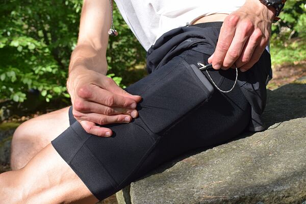 Elastická část má navíc na levé nohavičce velmi šikovnou kapsu, kam se s přehledem vejde i větší telefon, platební karty, sportovní gely nebo cokoli plochého, co byste mohli při svém výběhu potřebovat. Nad touto kapsou je i šikovný otvor na provlečení kabelu od sluchátek tak, aby nezavazel při pohybu.