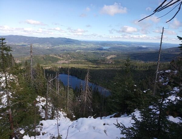 Velmi mile mě překvapilo, kolik českých i německých turistů jsem potkával na této trase a jak byli ohleduplní a pouštěli mě před sebe. Z Plechého už se sbíhalo po žluté vlevo dolů přes Stifterův památník až k Plešnému jezeru. Nešlo se občas nezastavit a nekochat se sceneriemi s výhledem na Plešné jezero a Lipenskou přehradu.