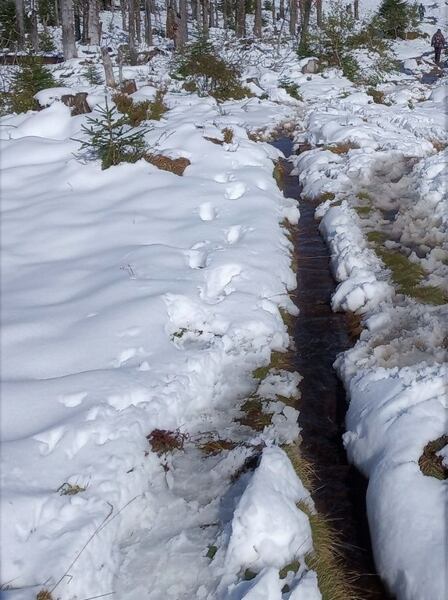 Cesta dále pokračuje po magistrále přes Vysoký hřeben, Trojmeznou, Trojmezí až na nejvyšší vrchol Šumavy – Plechý (1379 m). Těšil jsem se, jak si proběhnu celý úsek, protože jsem tuto trasu předtím absolvoval pouze na skialpech. Bohužel mi nebylo přáno a přes chodník se valily proudy vody nebo jsem se bořil do těžkého sněhu, ale i tak to byl skvělý adrenalinový zážitek.