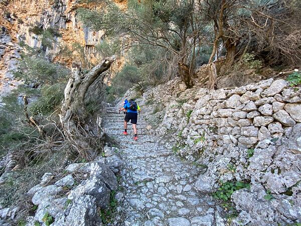 Úvodní 900 metrů vysoký švih měl podobu dlážděné cesty a drobných kamenných schodů. Za normálních okolností bych takový sklon svahu dokázal vyběhnout, ale v tak početné skupince plním průvodcovskou povinnost a jistím naší tlupu z posledního místa.