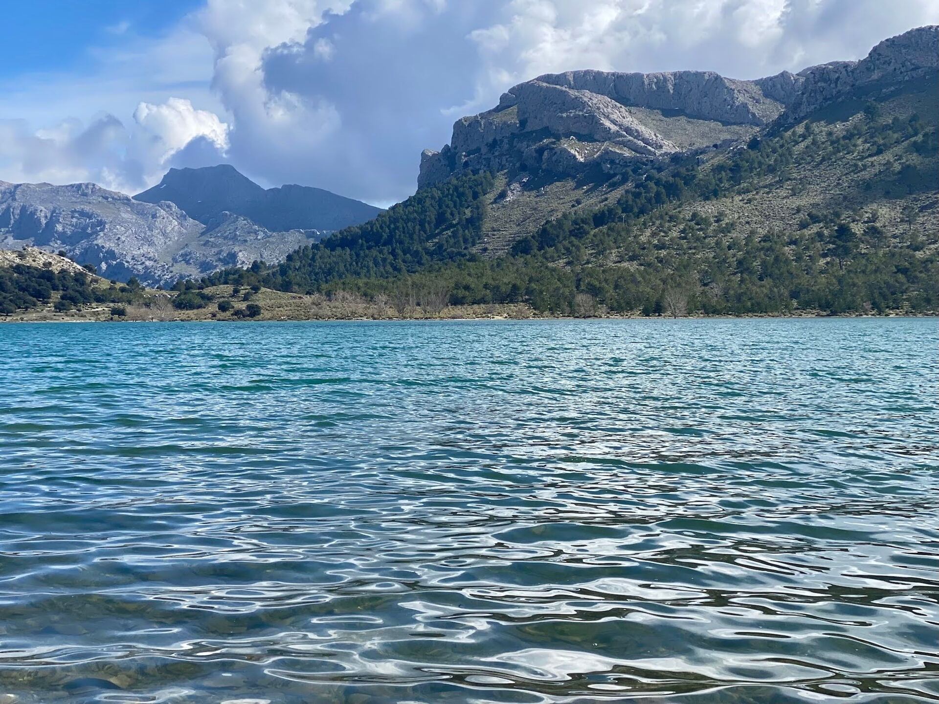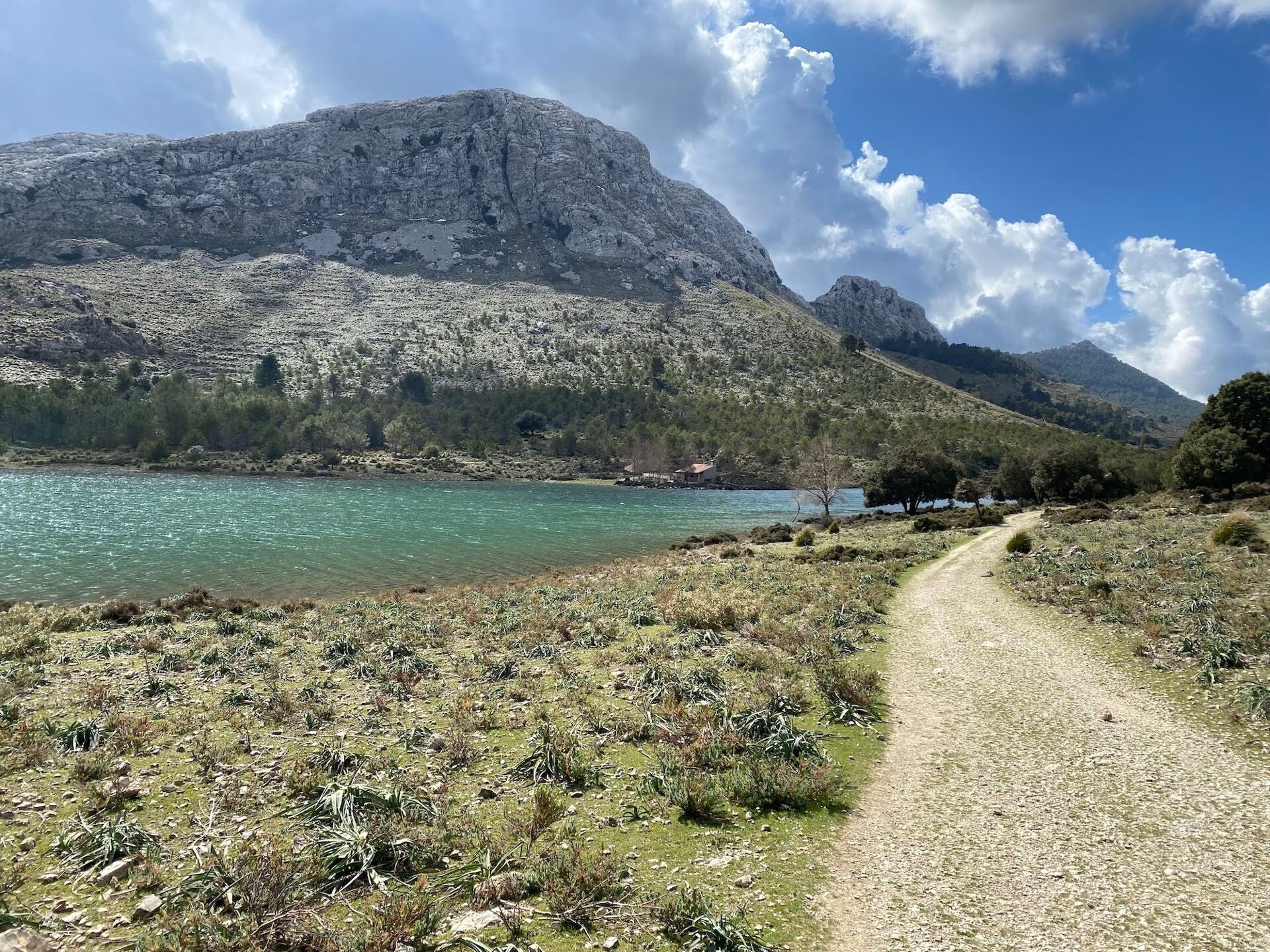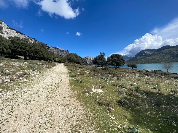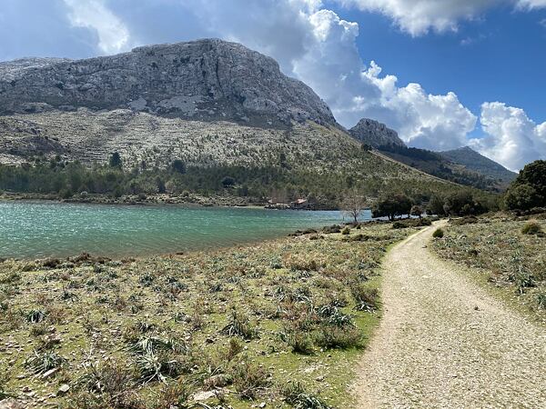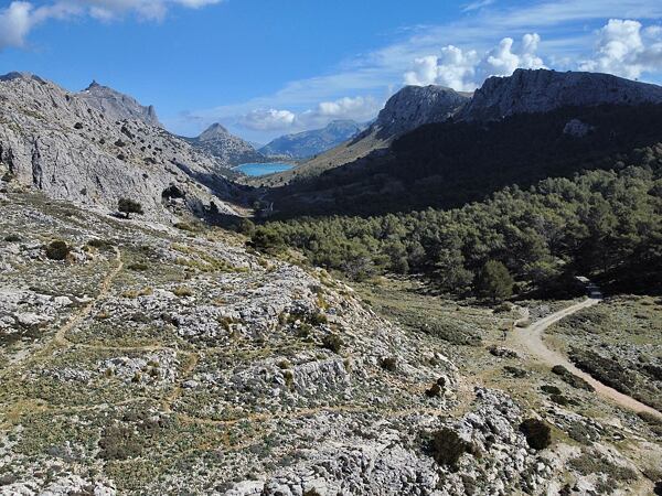 Trasa vede podél horského potoka a místy voda vymlela do skály impozantní tvary. Kousek pod vrcholem narážíme na skupinu, která zde provozuje canyoning. Zajímavé místo. Dobíháme do sedla Coll de l’Ofre a kocháme se výhledem na nedaleké jezero. Jedná se o rezervoár pitné vody, který musíme oběhnout a nachází se pod nejvyšší horou Mallorky, Puig Major (1 436 m).