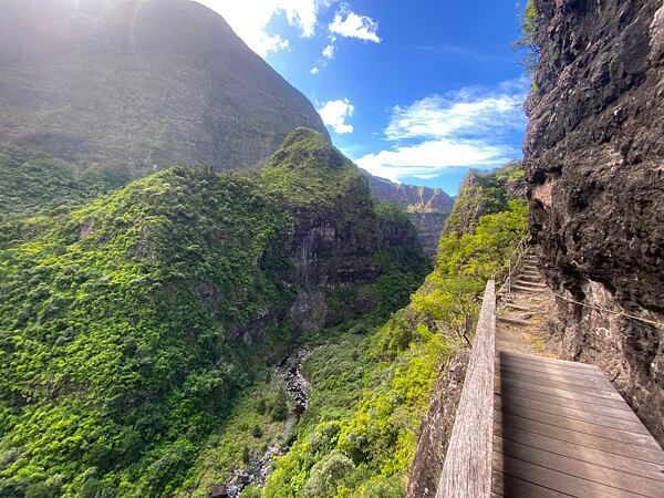 Pokračujeme dál a probíháme po dřevěných chodníčkách stezkou, která jako kdyby z oka vypadla australskému The Great North Walku. Pár kilometrů na to, si při stoupání do sedla Taïbit připadám jako někde Nepálu a těsně před městem Cilaos navštěvujeme vodopády podobné těm, které může člověk spatřit na Madeiře. Wau! Tolik úžasných míst na několika málo kilometrech!