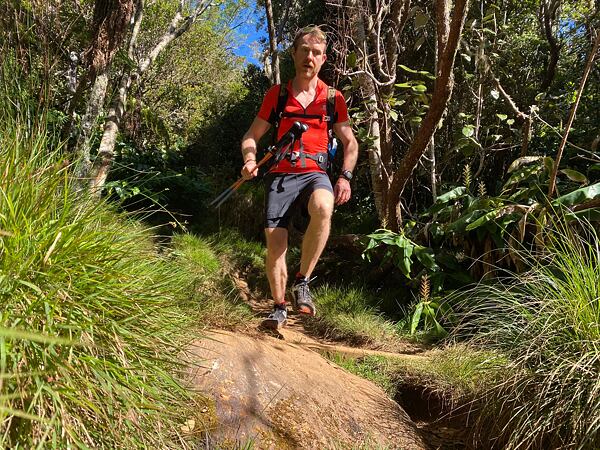 Úzká stezka je ze všech stran obklopena nepropustnou džunglí a jako podložku tvoří různě porostlé kameny odlišných tvarů a všech myslitelných velikostí. Zatímco u nás těžko „sbíháte“ kopec rychlostí 12 minut na kilometr, tady je takové cupitání na běžném pořádku.