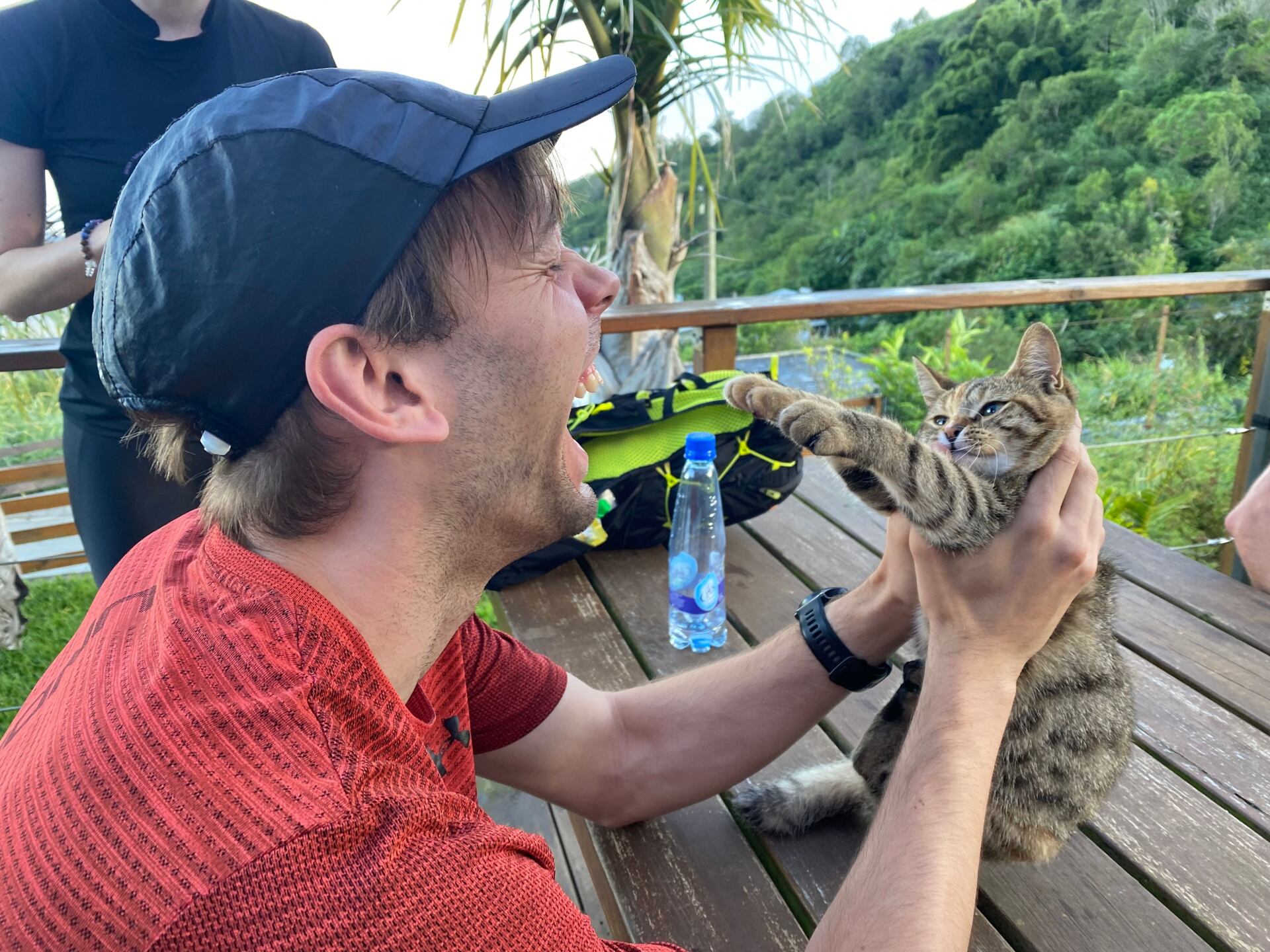 Třetí den začínáme nedaleko města Grand-Îlet a k našemu překvapení probíháme naprosto kouzelným lesem hobitího typu. Tenhle kout ostrova má neskutečné genius loci a probírá nás až přítomnost občerstvovací stanice. K našemu překvapení se tu totiž zrovna dnes koná běžecký závod a máme tu čest zahlédnout nejrychlejšího závodníka.