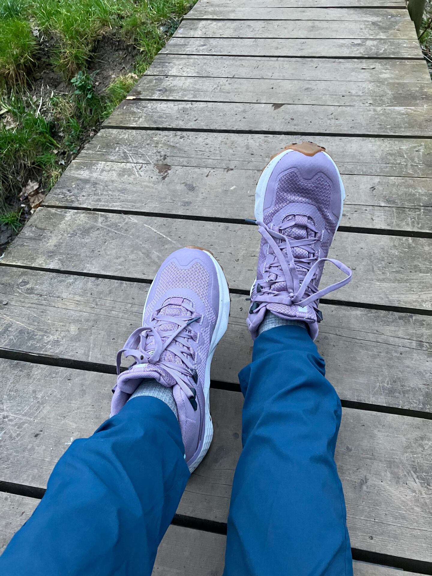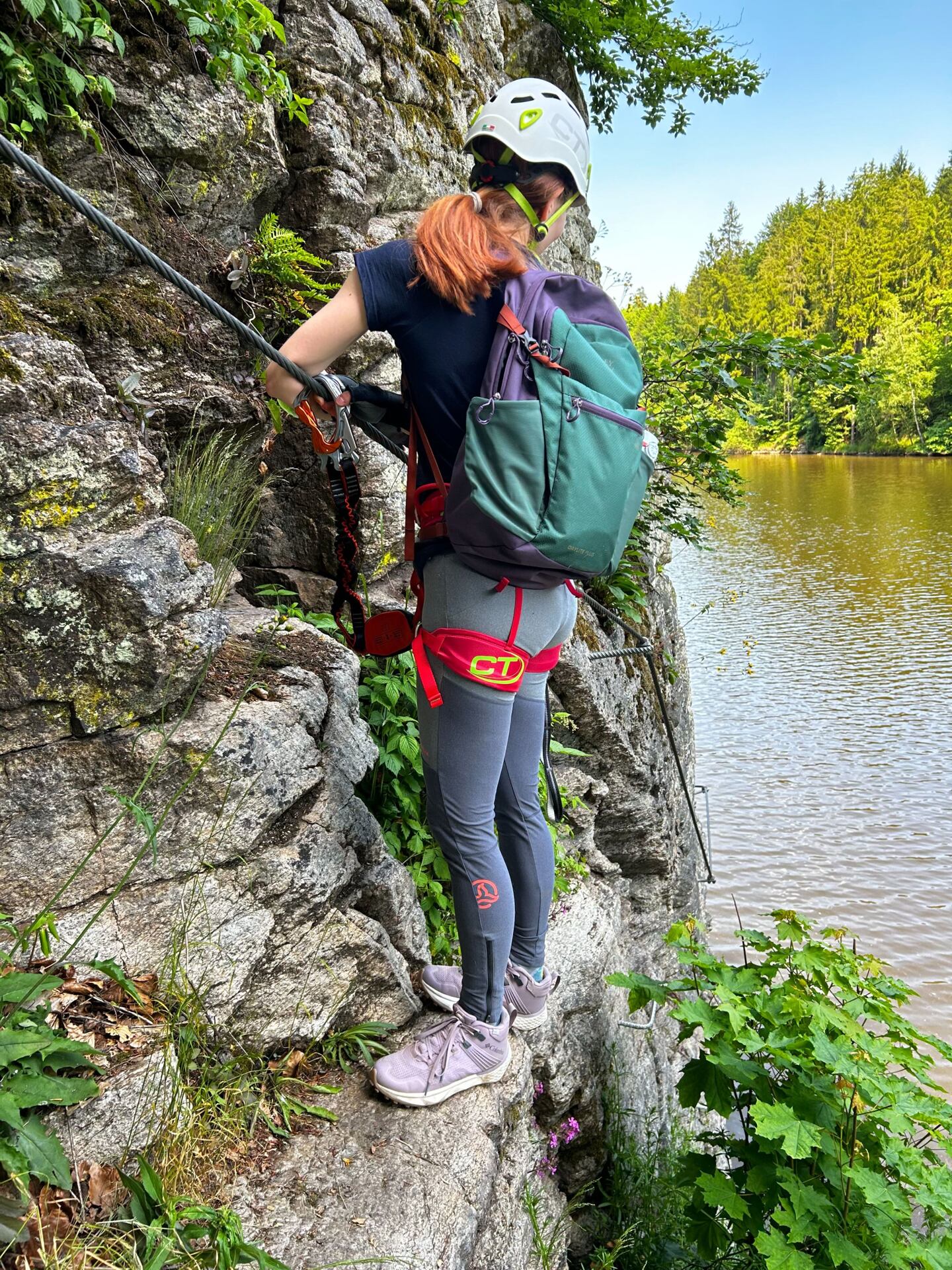 Pro důkladné otestování jsem si zvolila rozmanitou trasu z Purkarce na ferratu Hluboká nad Vltavou. Boty sice nejsou na ferraty určené, ale já jsem tuto lidmi oblíbenou aktivitu podstoupila a cestu s nimi dala úplně bezproblémově. Člověk si zde vyzkouší jak chůzi po asfaltu, tak i v terénu ze strmějšího kopce a zpátky. Když dojdete k ferratě, můžete si zvolit mezi dvěma úseky. Já jsem si pro otestování zvolila tu těžší část, délku 400 m, náročnost C/D.