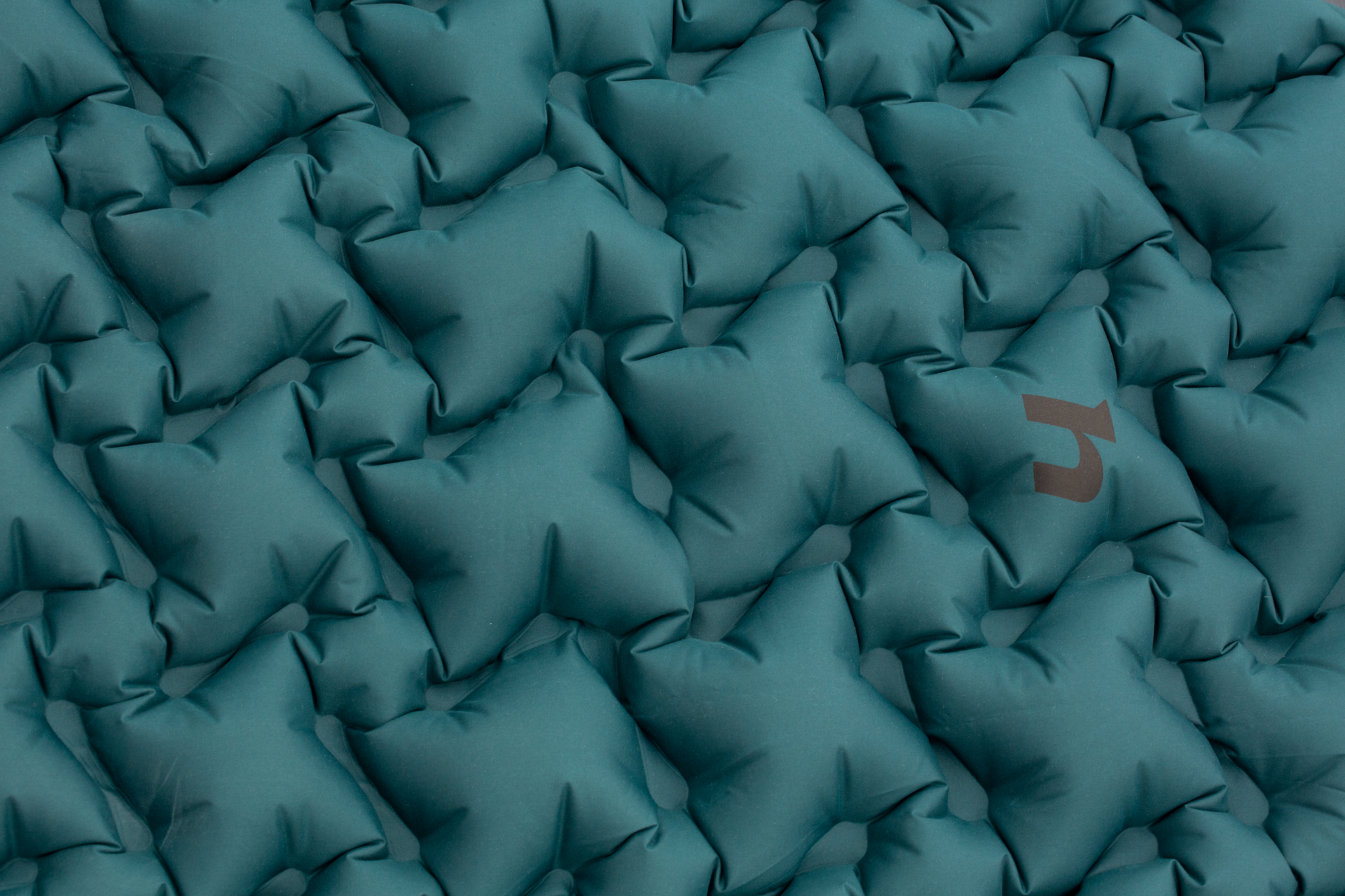Líbí se mi design "polštářků", ze kterých se karimatka skládá. Je to zajímavé řešení, které pomáhá rovnoměrně rozložit váhu a vyrovnat nerovnosti. V oblastech s větší zátěží (hlava, ramena, bedra) jsou "polštářky" větší, což umožňuje pohodlnější posezení na karimatce, v oblasti zad jsou menší.