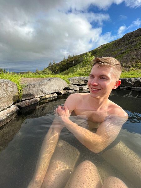 Jedeme směr odlehlejší západní fjordy! Je tu ale jeden zásadní fakt: méně turistů = horší cesta. V půlce (polní) cesty na fjordy měníme píchlé kolo. Mrzení však netrvá dlouho. Noc jsme totiž strávili u hot potu Guðrúnarlaug. Hot poty jsou přírodní nebo lidskou rukou vytvořená termální jezírka s průměrnou teplotou vody kolem 40 °C, kterých najdete po ostrově spoustu. A tenhle přišel jako na zavolanou. Je hned u kempu, najedete tu i udržovanou převlékárnu a když vás stejně jako nás přivítá sluníčko, máte pocit, že líp už být nemůže.