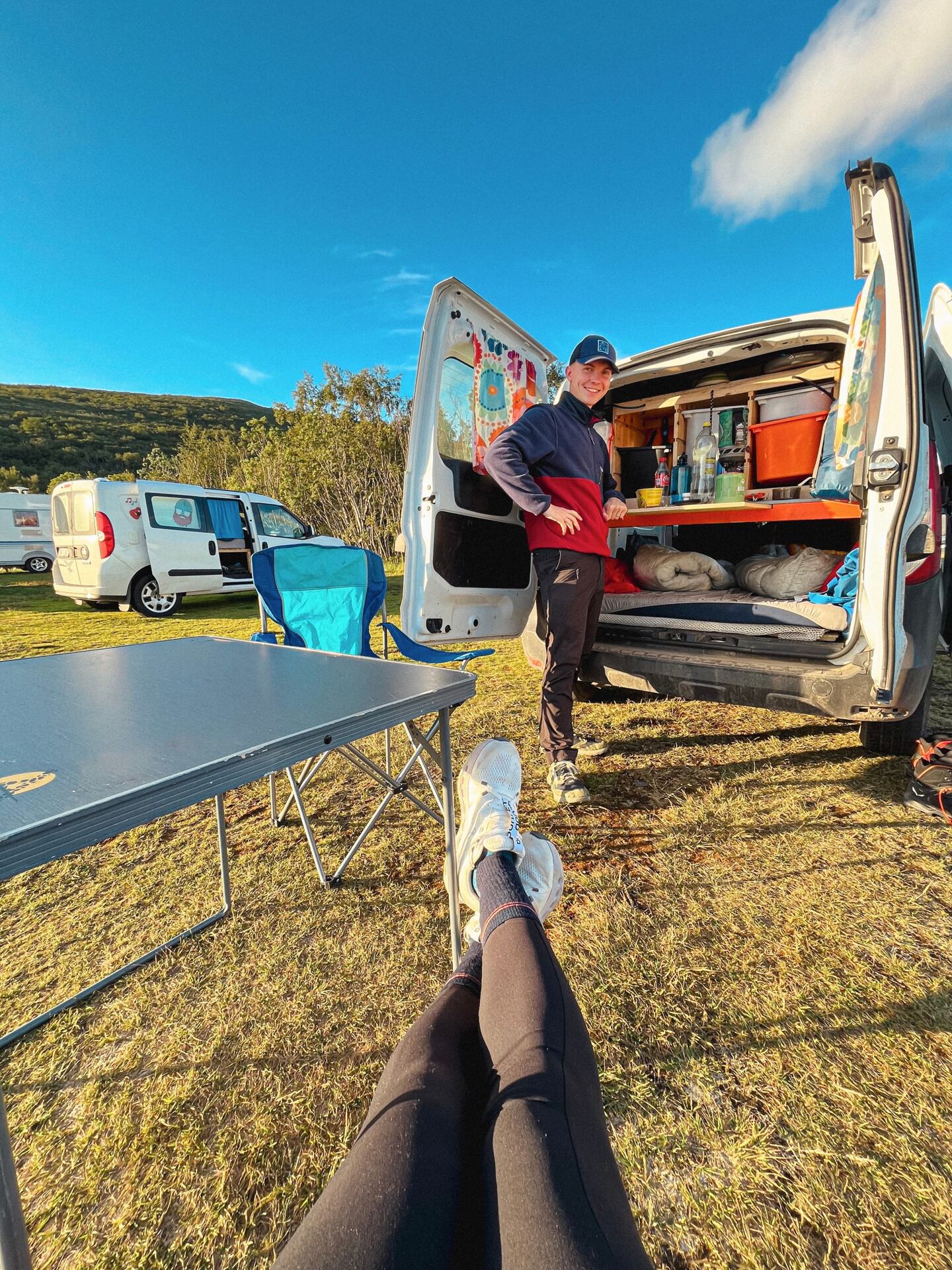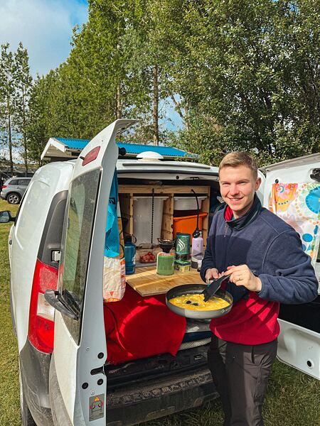 Jako za odměnu jsme se další den probudili do krásného slunečného počasí. Konečně jsme si tak užili přípravu snídaně v naší auto kuchyňce a dali si výborná míchaná vajíčka.