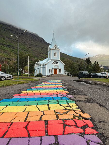 U známějších míst jsme zůstali i déle. Všichni určitě znáte fotku s tím krásným kostelem a duhovým chodníkem, že? Přesně tu si můžete, stejně jako my, pořídit ve vesničce Seyðisfjörður.