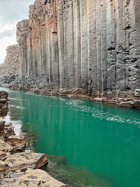 S autem plným mokrého oblečení jedem dál. Další zastávkou je jeden z profláklých turistických cílů, kaňon Stuðlagil. Když vidíme ty mohutné čedičové sloupy a zářivě modrozelenou vodu, ničemu se vlastně nedivíme - sami jsme tu pár hodin strávili. A rádi.