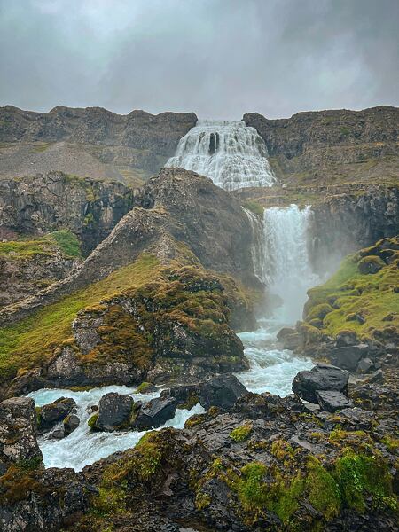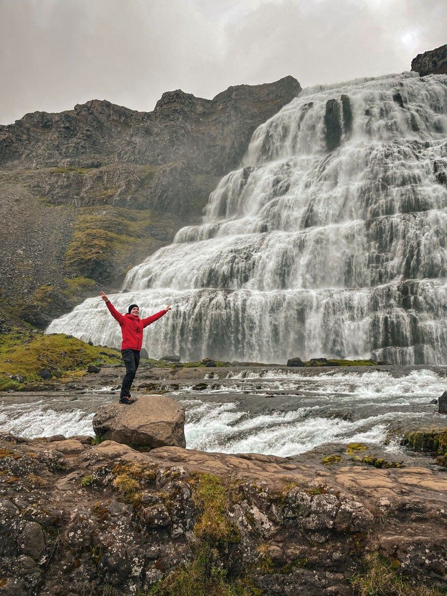 Jestli k Islandu něco opravdu patří, pak jsou to vodopády. Hned ráno se vydáváme na jeden z nejhezčích - Dynjandi. Skládá se z několika kaskád a díky upravené a trochu strmé stezce se můžete dostat až pod nejvyšší z nich. Ve chvíli, kdy stojíte doslova pár metrů od té nejmohutnější části celého vodopádu, máte zároveň výhled na celý fjord Dynjandisvogur.