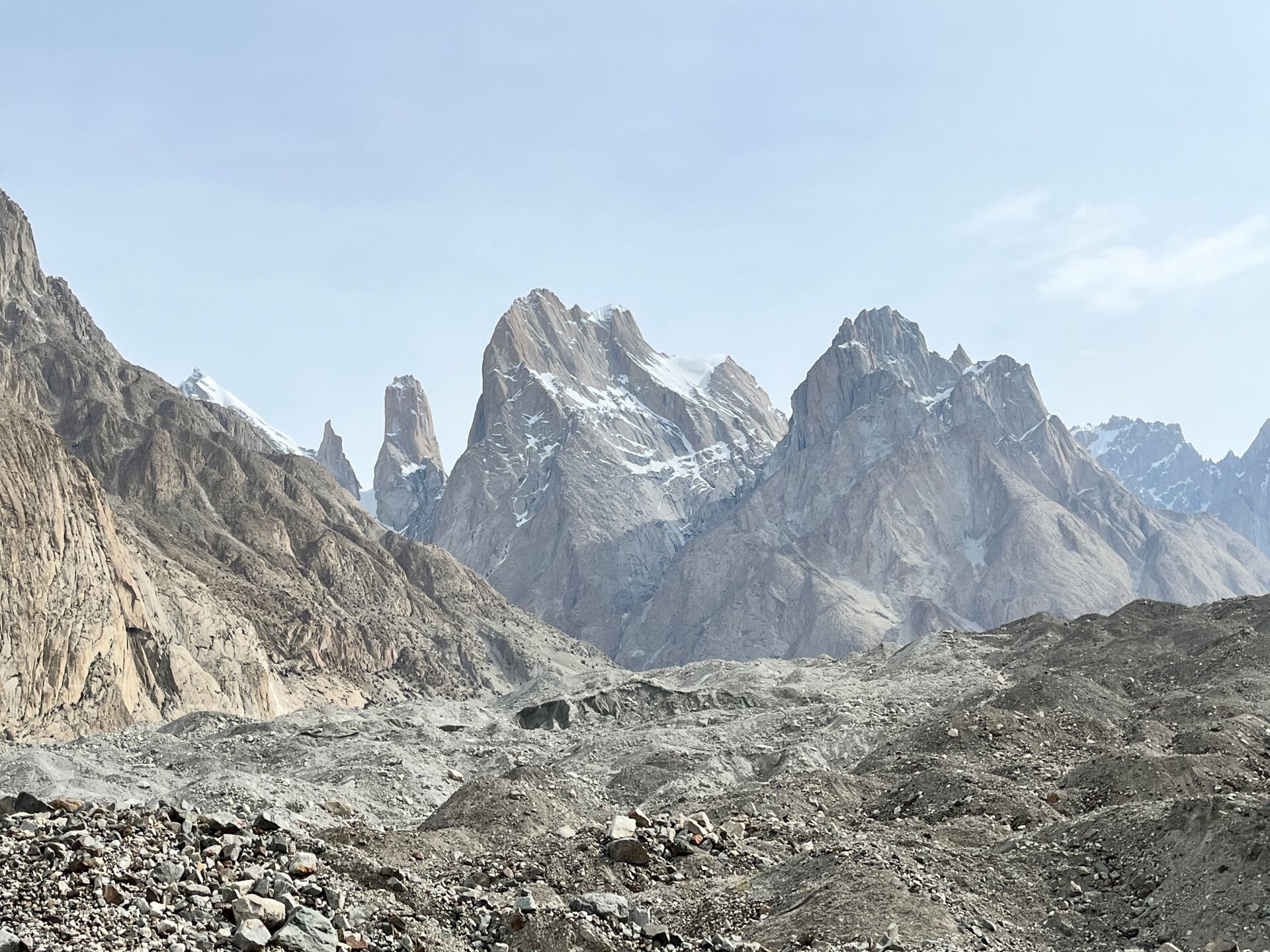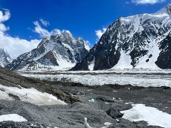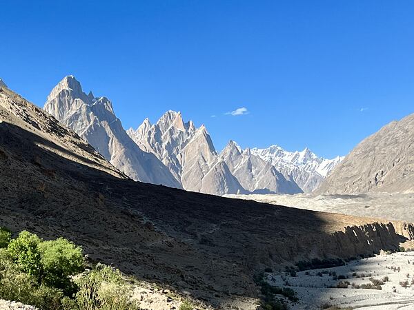 Každý kopec zde má svůj příběh. Míjíme šesti a sedmitisícové hrozivě vypadající Trango Towers, Masherbrum, Muztagh Tower, Gasherbrum IV a další. Oproti osmitisícovkám mají tyto nižní obři jen zlomek výstupů, třeba Masherbrum byl naposled vylezen v roce 1985…