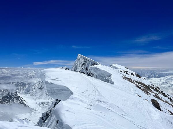 Martin se brzy ujímá místa v čele pelotonu a neúnavně jde za svým cílem. Peloton brzy prořídne a na zbytek výstupu se oddělujeme pouze ve čtyřčlenné skupince. Jde s námi Pákistánec Sajíd, syn legendárního pákistánského horolezce Ali Sadpary, a na provázku si táhle kyslíkem ověnčenou ruskou klientku. Konečně po nekonečné převěji docházíme kolem jedné hodiny odpoledne k vysněnému cíli.