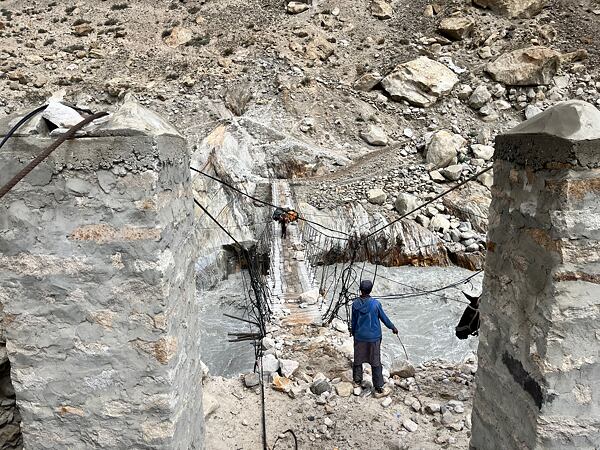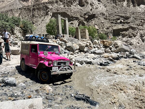 Džípem odjíždíme na začátek treku do vesnice Askole. Předpokládaných 8 hodin jízdy se mění v nekonečnost v momentě, kdy se před námi urve kus cesty. Bylo velkým zážitkem vidět asi 200 Pákistánců, co se v tu dobu rozhodne cestu znovu postavit. Několik hodin pomocí lidského řetězu hází tento dav vášnivě kameny na místo zhroucené cesty, až sesuv zcela vyspraví a již za tmy můžeme jet dál.