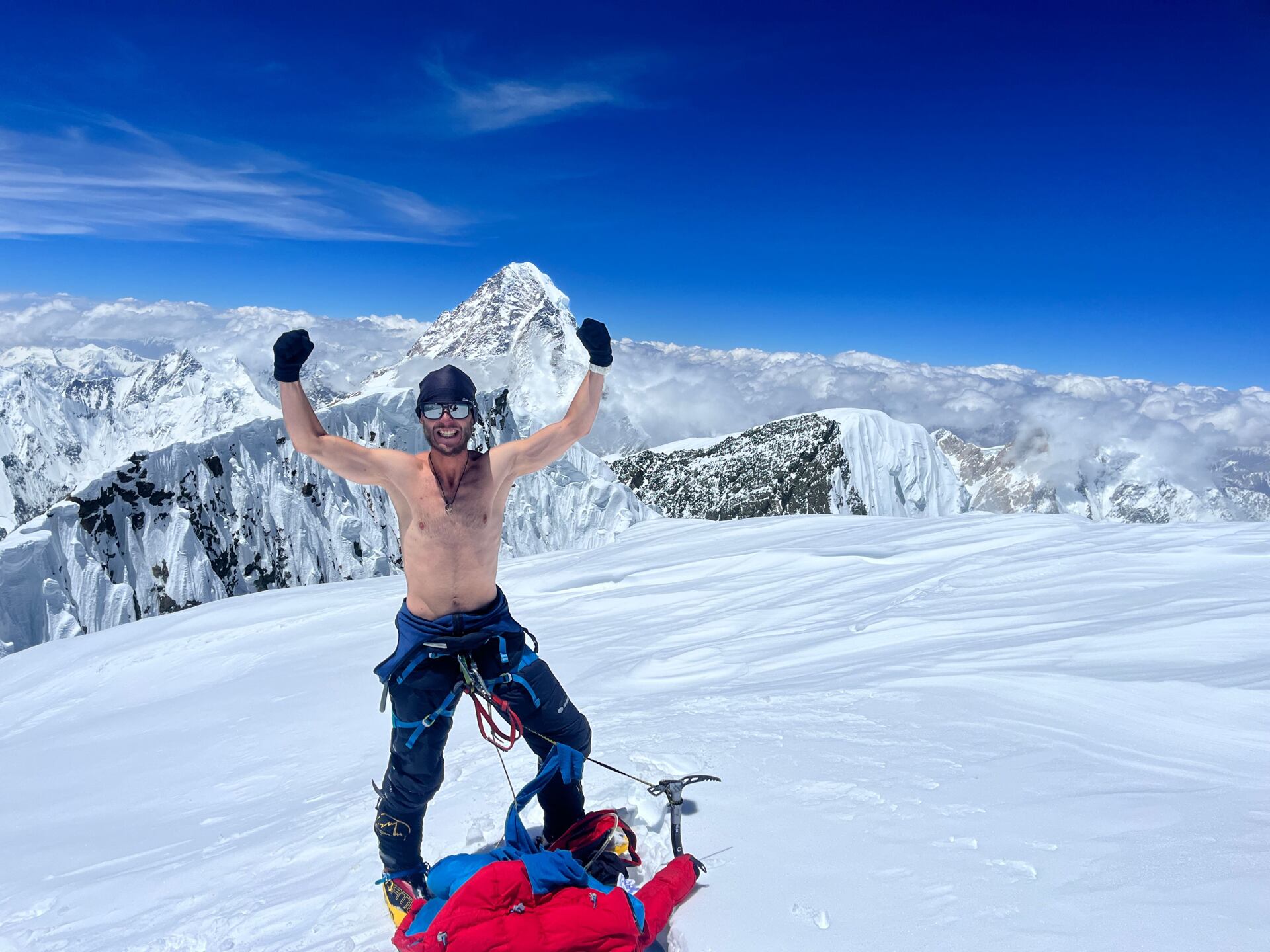 Tempu Martina již delší dobu nikdo nestačí, ale přesto na mě čeká pár metrů pod vrcholem, abychom těch pár posledních kroků šli společně. Stojíme spolu na vrcholu třetí společné osmitisícovky! Je krásné počasí, téměř bezvětří, žádná velká zima. Spontánně pózuji svlečen do půl těla a raduji se z krásného dne.