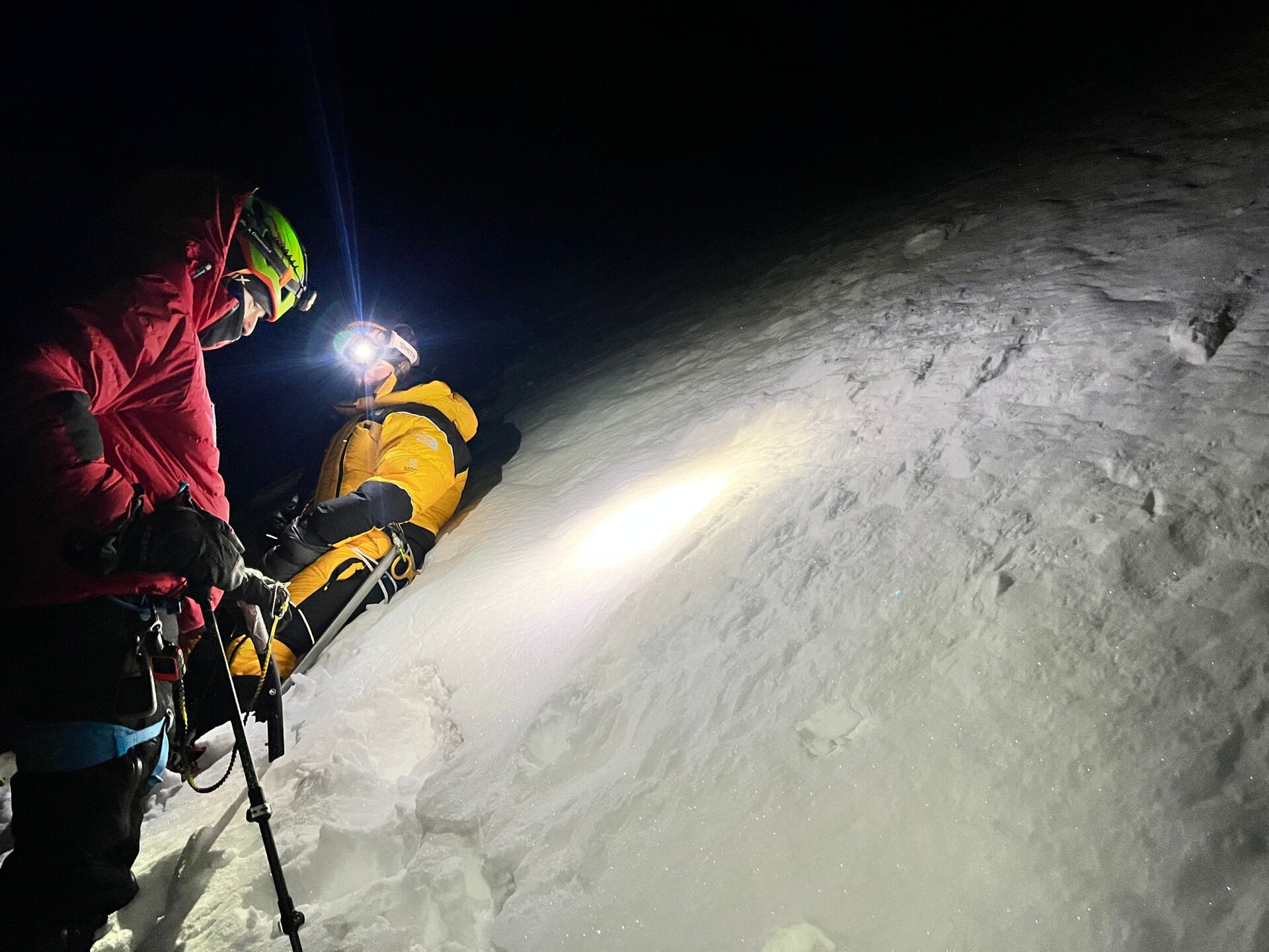 Já, Martin a Honza vyrážíme o půl druhé v noci. Na svahu před námi svítí pár čelovek. Parta Poláků a směska dalších národností je již na cestě. Mezi nimi i Sarah. Brzy skupinu dobíháme a střídáme se v prošlapávání hlubokého sněhu. Již po pár hodinách vidíme, že Honza dnes svůj boj na kopci nevyhraje. Výrazně ztrácí, až se zastavuje úplně a vrací se do stanu. Tam potkává Pavlínu, která k vrcholu ani nevyrazila. Nedostatečná aklimatizace ji výše nepustila.
