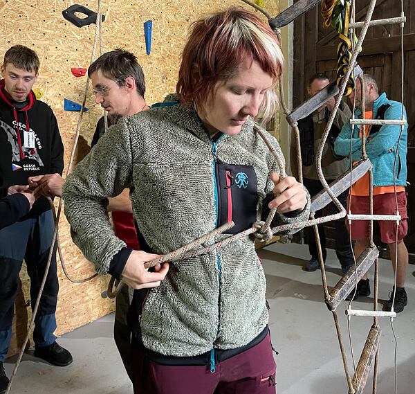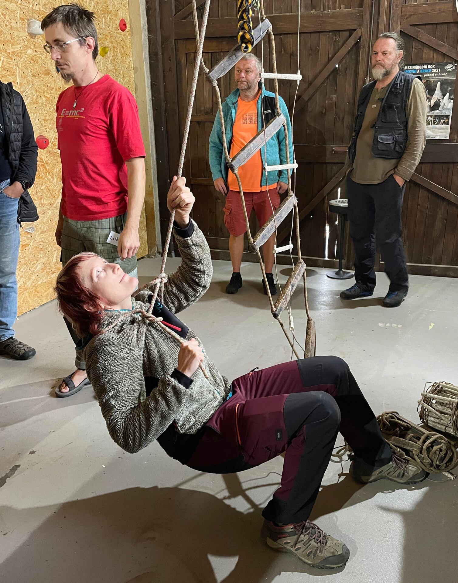 Mikina mě v nepříliš vyhřátém prostoru udržela v tepelném komfortu a při čekání vleže na sportovních matracích na další část výkladu o historických i současných speleologických pomůckách a vybavení mě málem ukolébala k spánku.