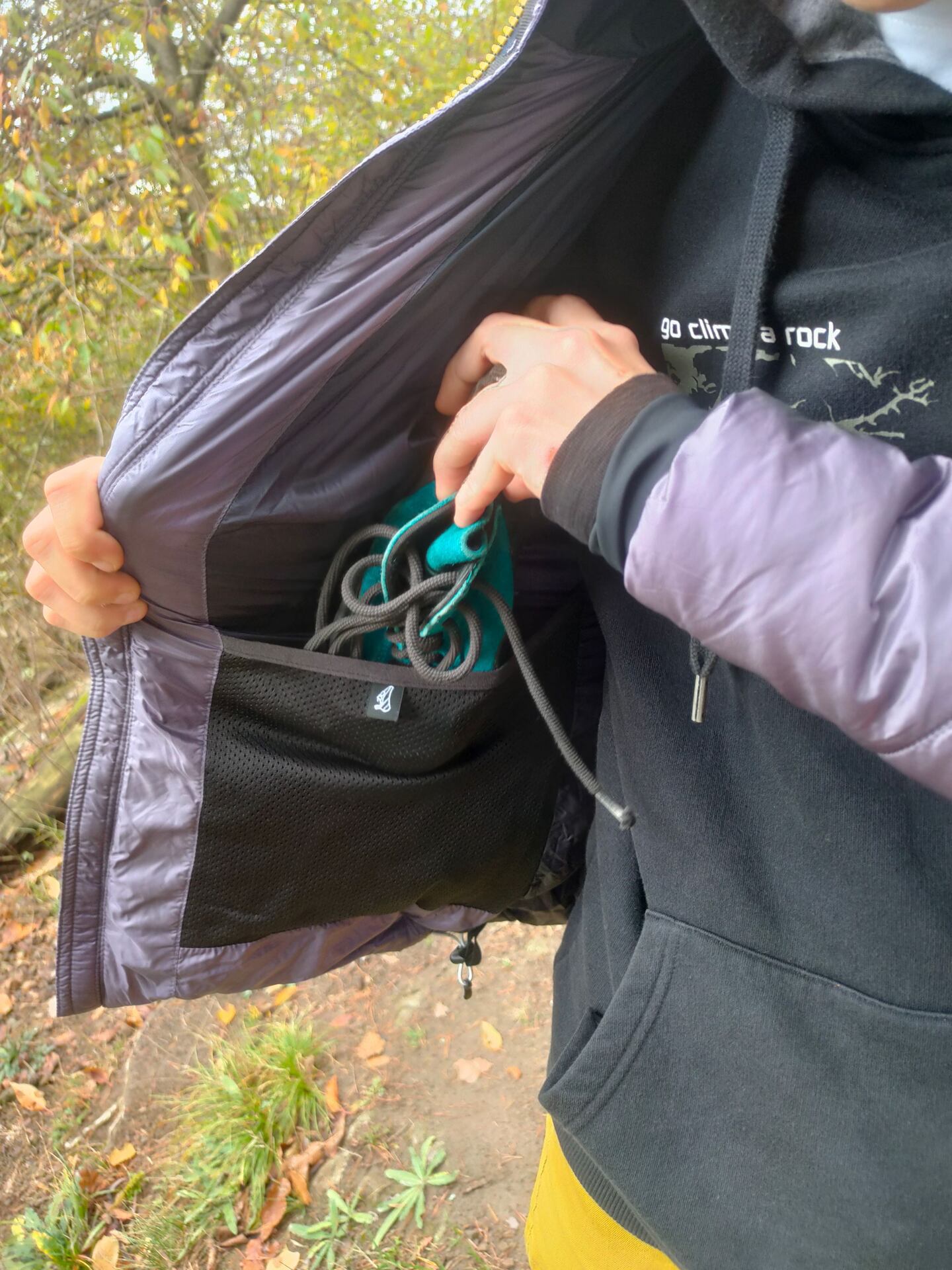 Součástí bundy je transportní pytlíček, který se dá pomocí očka připnout na sedák a vylézt s ním pohodlně na věž. Při větrných podzimních dnech se člověk při dobírání druholezce do bundy velice rád zachumlá.