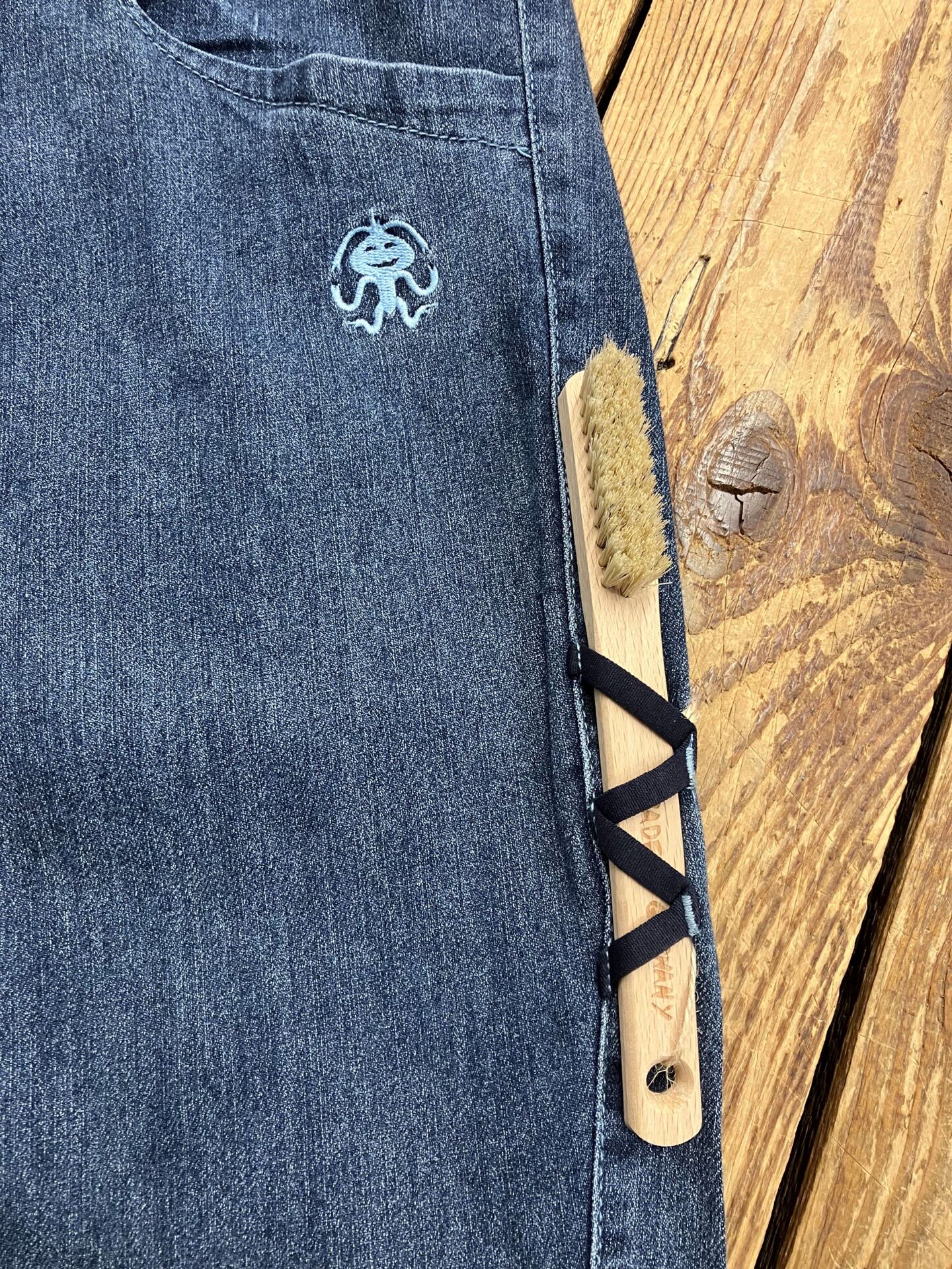 Na levé přední kapse se nachází symbol Rafiki panáčka. Panáček se ještě objevuje na zadní straně pravé nohavice v oblasti kolene, kde ho doplňuje nápis Ready To Climb. Tyto detaily jsou poměrně malé, a tak nenarušují vzhled riflí.