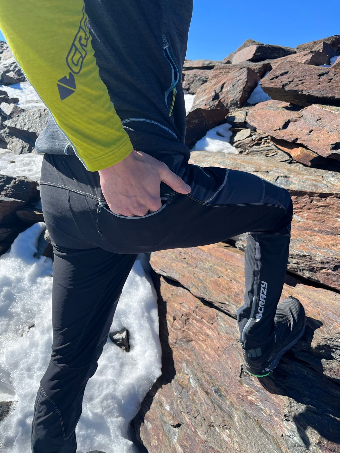 Zip na zadní části nohavice umožňuje přetažení přes komín skialpových bot nebo pohorek