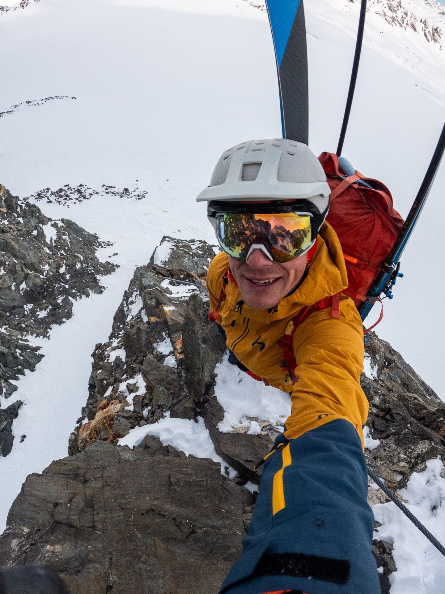 Na ledovci už je vidět hned několik mravenců, kteří přišli dlouhou trasou z Lüsens. Traverzem horní části ledovce se napojuju na výstupovku a lyže parkuju jen pár metrů pod vrškem. Je kolem poledne a den dneska vychází počasím na jedničku. Nasazuju lyže a těším se na sjezd. Slunečná orientace vypadá navzdory jinak divokým podmínkám slibně. To se opravdu naplní. Strmý začátek je výživný, oprašuju chabé znalosti skákaného oblouku. Když už se to pokládá, vypne mi špička a zároveň i sichrák a jedna lyže se vydává napřed. Naštěstí se opět zdárně potkáme, všechno zamknu a po krásném ledovci přijíždím do Längentalu. Mrazivými svahy jedu dlouhým traverzem k chatě Westfallenhaus.