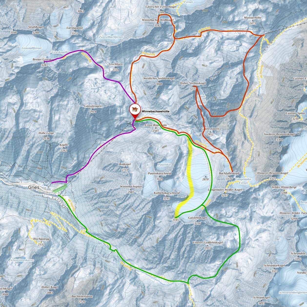 Za hodinku, opět na blahodárném slunci, přemýšlím, že bych to zkusit ještě natáhnout na vedlejší Winnebacher Weißkogel (3182 m), na který se dá dobře chodit jak z Griesu, tak z Lüsens, případně ze zmiňovaných chat. Dneska už se nastoupané metry přehouply přes dva tisíce a v nohách je to znát.