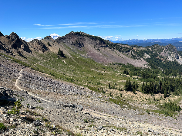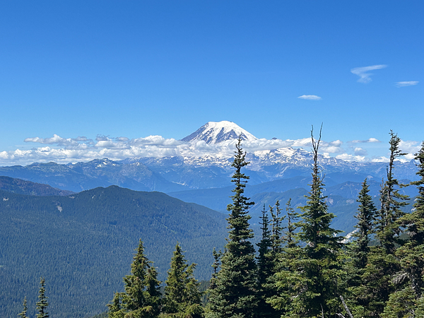 V oblasti Goat Rocks bylo nádherných výhledů opravdu mnoho. Jen co jsme ráno vyšlápli do prvního sedla, hned jsme koukali na další obrovskou sopečnou horu pokrytou ledovci Mount Rainier (4 392 m n. m.) a k tomu na krásný hřeben, po kterém jsme dále sestupovali ze sedla. Zbytek dne jsme spěchali do White Passu, kde byla otevřená čerpací stanice se zázemím pro hikery. Přišli jsme asi hodinu před zavíračkou, takže to bylo krásné zakončení s nakoupeným jídlem.