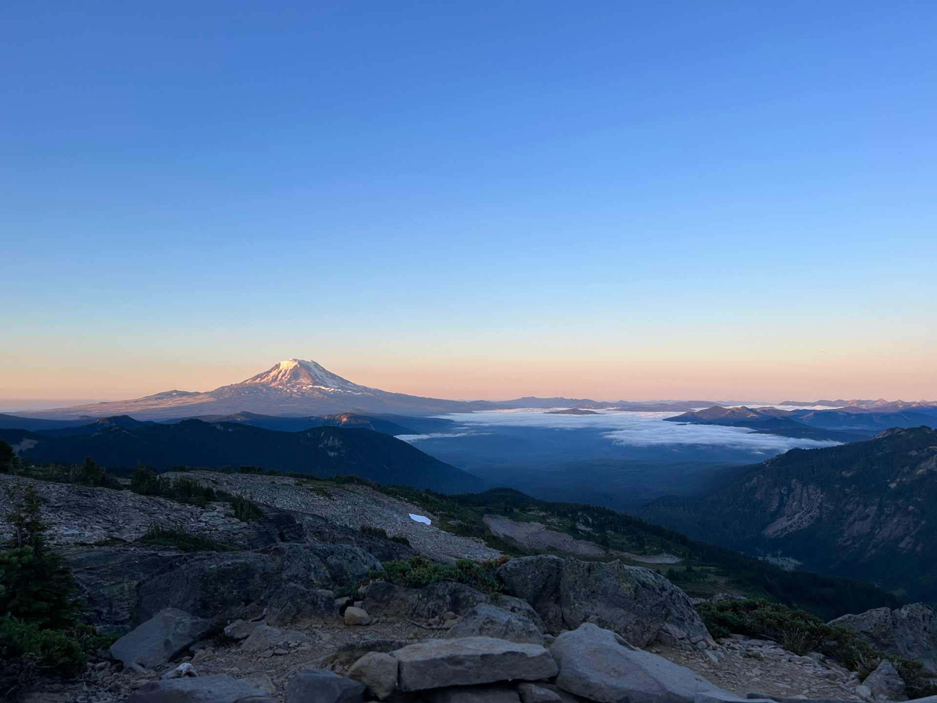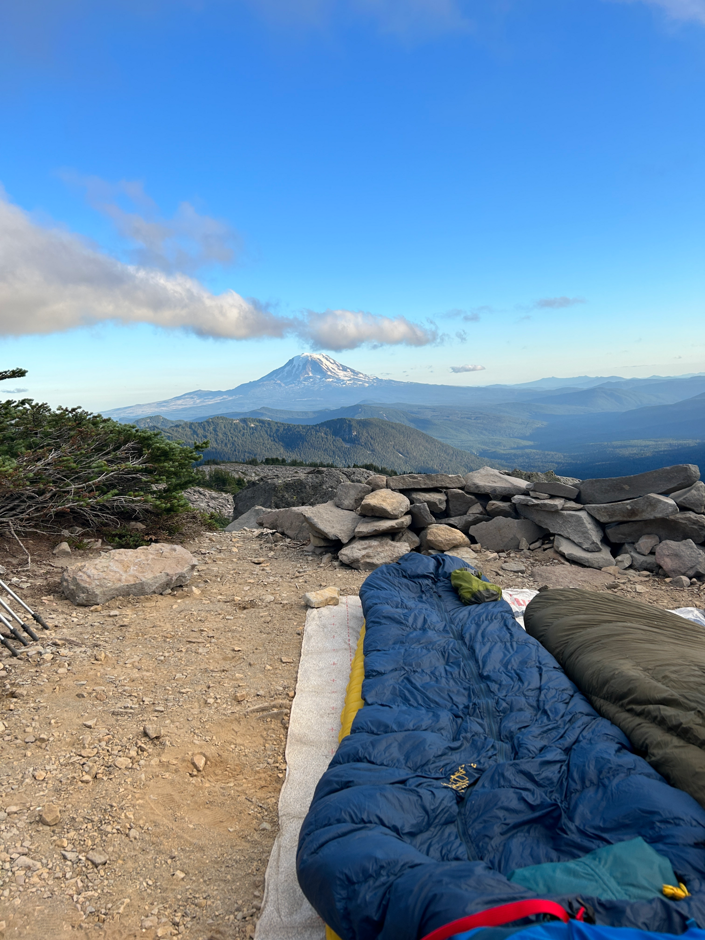 Trout Lake jsme všichni opustili hned další den brzy ráno. Během následujících dvou dnů jsme prošli kolem monumentální sopečné hory Mount Adams (3 743 m n. m.) až do nádherné oblasti Goat Rocks, kde jsme také spali na jednom z nejkrásnějších míst na trailu s výhledem právě na Mt. Adams.