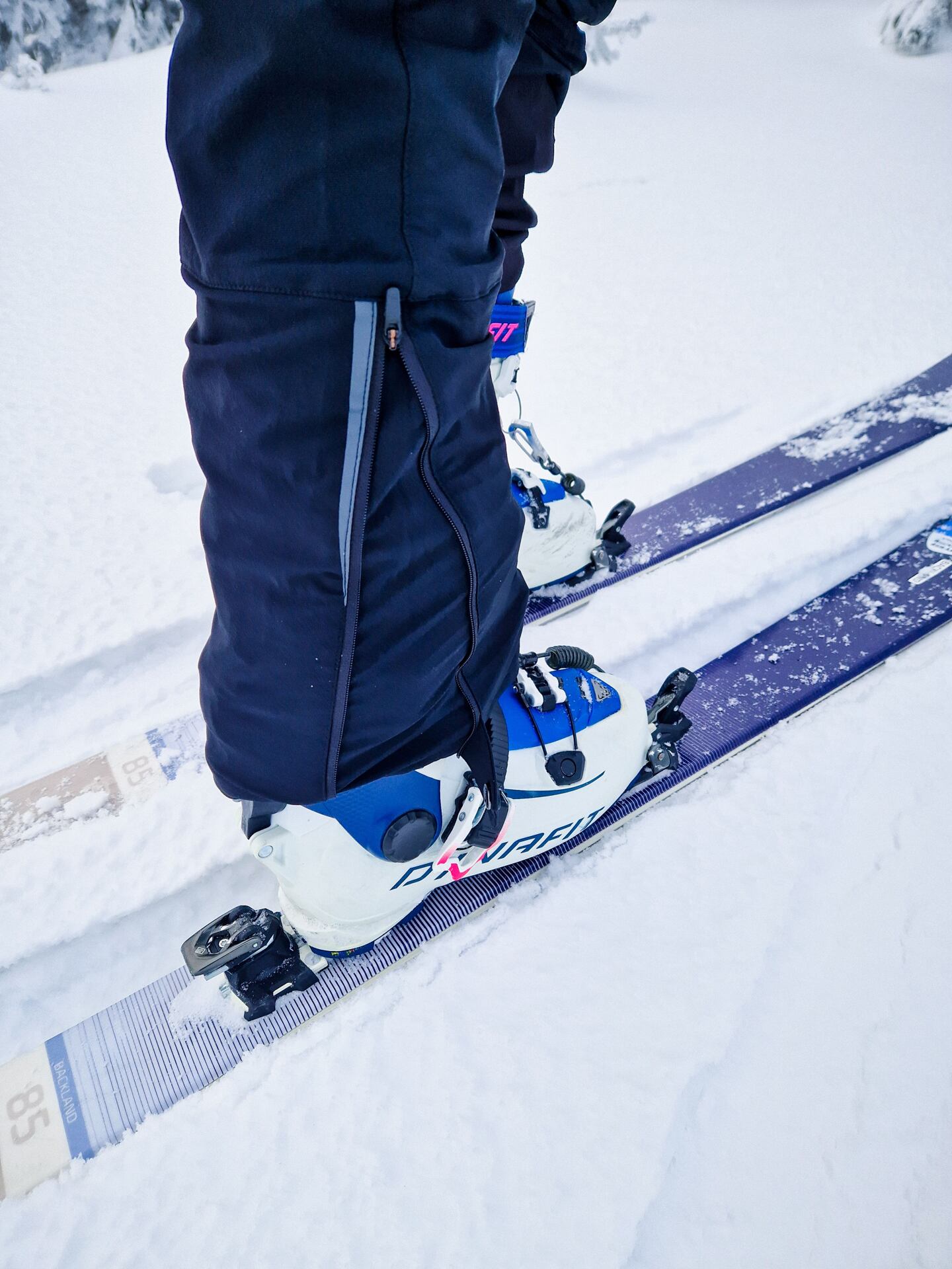 Vnější strana nohavic je s rozparkem na zip, což právě ocení hlavně skialpinisté. U zipu na nohavicích najdeme malý reflexní prvek. Osobně bych ocenila ještě o něco delší zip, abych rozepnuté kalhoty bez problému přetáhla přes mojí skialp botu.