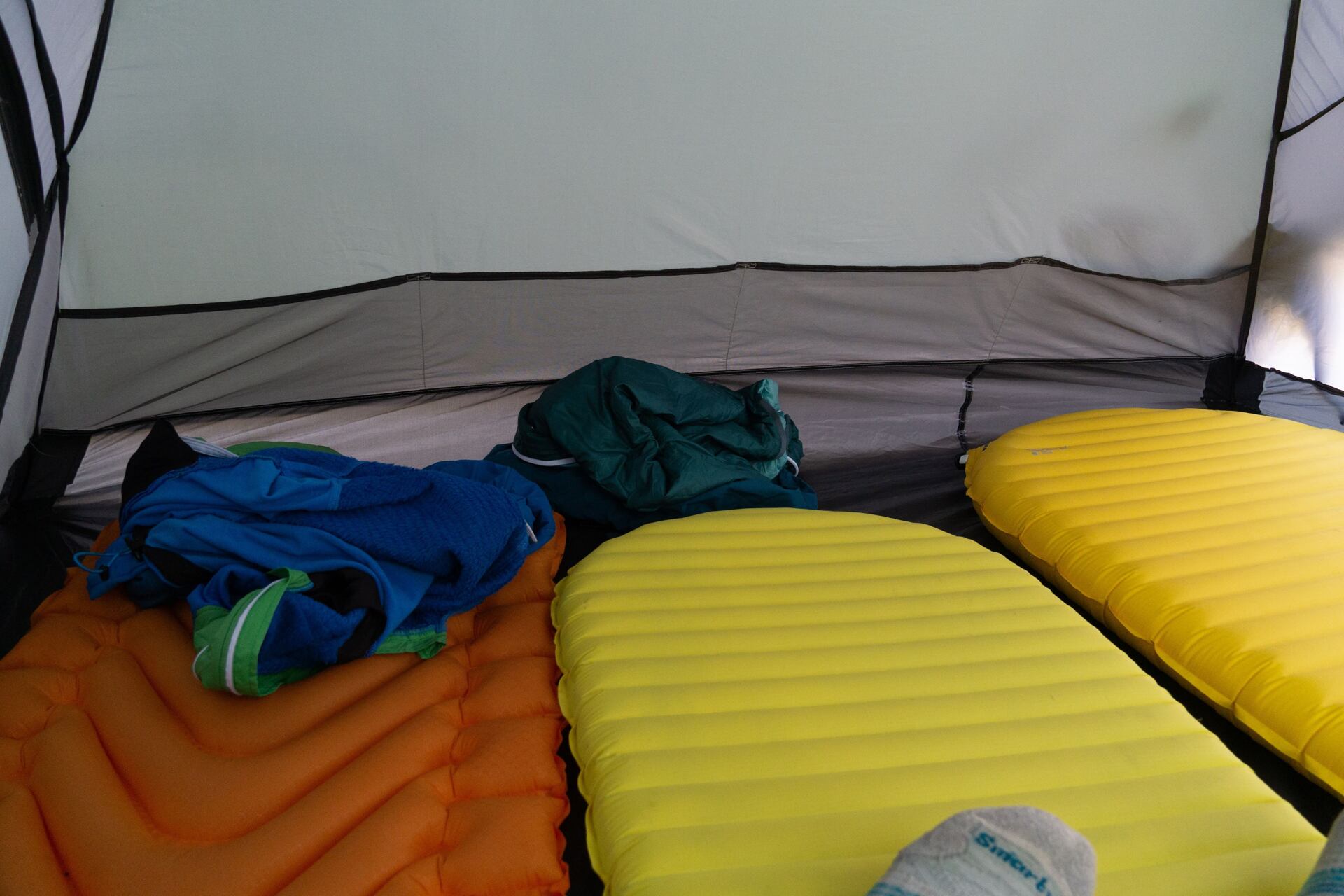 Díky příčnému prutu, který zvětšil objem ložnice směrem ke vchodům, zde bylo dost prostoru, abychom se všichni tři dokázali sbalit uvnitř, i když pršelo. Do předsíněk se vešly všechny naše věci a stále bylo možné pohodlně projít ven.
