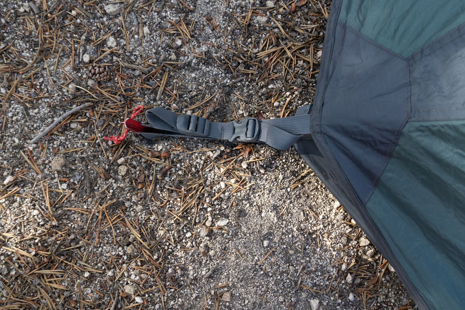 Délka přezek lze nastavit, čehož jsme využili zejména, když se zvedal vítr, a my potřebovali přitáhnout tropiko co nejníž k zemi. V těchto případech jsme také využili ok pro zavětrování stranu. V každém rohu jedno. Jen je potřeba myslet na to, že s jejich použitím se musí také tropiko, s pomoci suchých zipů, připnout k tyčkám.