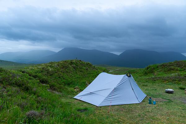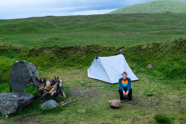 Pár kilometrů před mokřady/vřesovištěm Rannoch Moor se začínáme poohlížet po nějakém místě na stan. Vše je dost podmáčené, ale občas se nějaký plácek objeví. Nakonec nalézáme luxusní místo, kde je sucho, je to trochu v závětří, schované z cesty a také je v blízkosti potok. Stavíme stan, vaříme večeři. Díky větru se nemusíme starat o midgets..